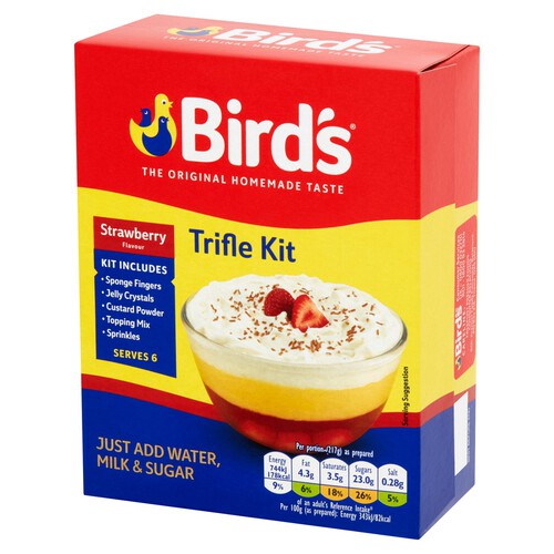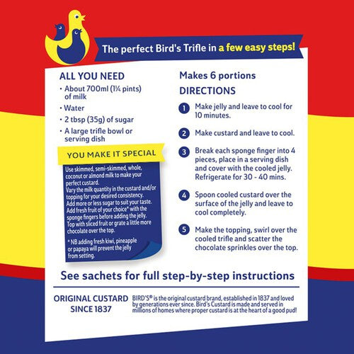 Read MoreWhip up your own delicious strawberry trifle in a few simple steps for the perfect dessert to enjoy at home with loved ones. Use milk or a milk alternative to make your perfect custard. Vary the milk quantity in the custard and/or topping for your desired consistency. Add more or less sugar to suit your taste. Finish with a slice of fresh fruit* and sponge fingers before adding the jelly or grate a little more chocolate over the top. Bird's® is the original custard brand, established in 1837 and loved by generations ever since.