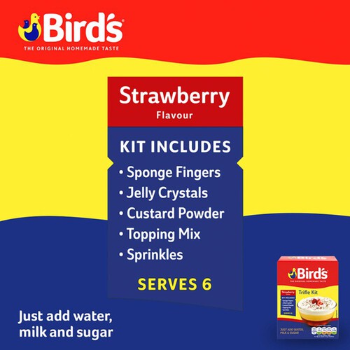 Bird's Strawberry Trifle Dessert Kit, Perfect dessert in just a few easy steps!, Just add water, milk/milk alternative & sugar, Makes 6 portions, Suitable for vegetarians