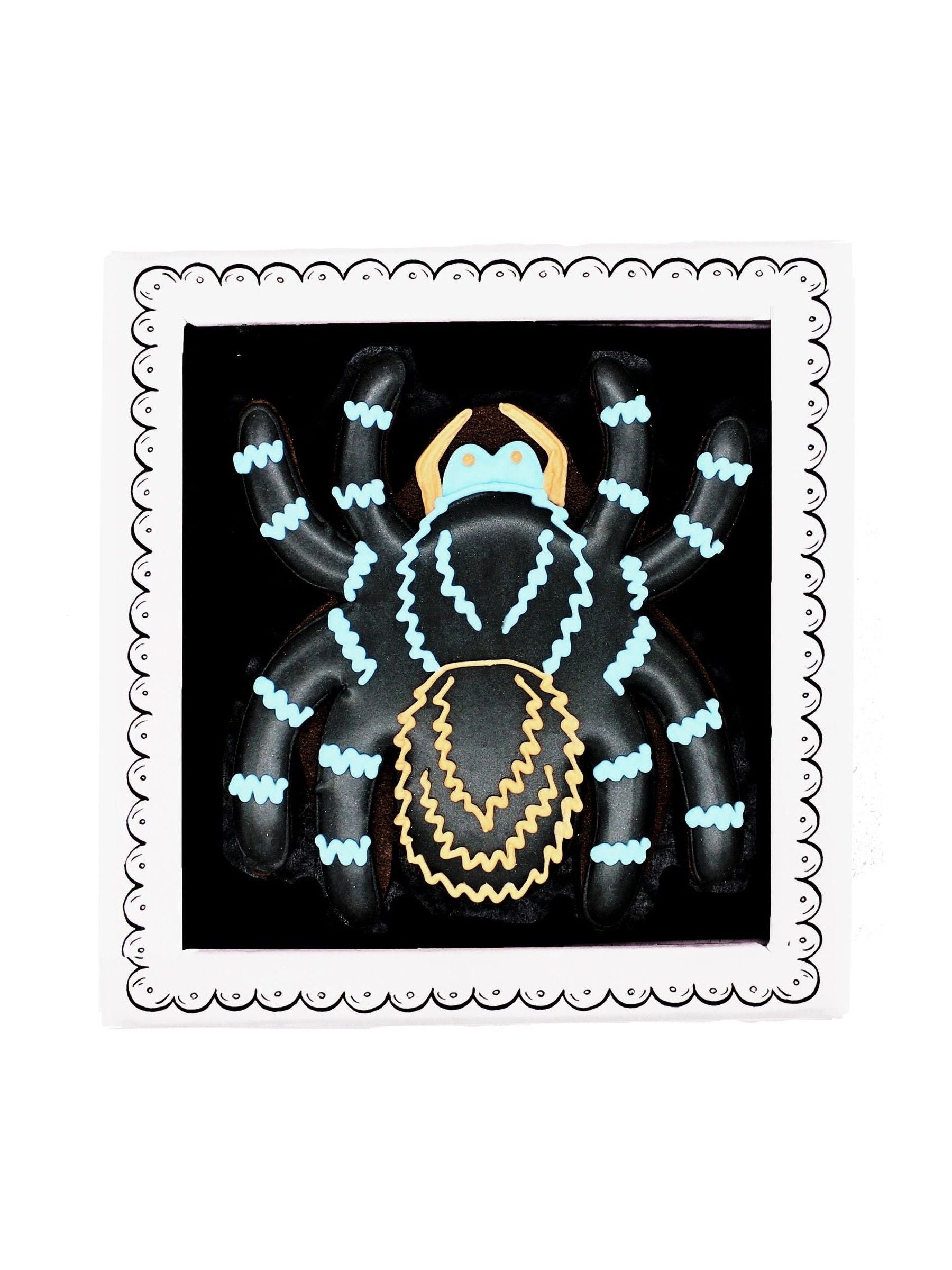 Ever heard of love at first bite? Designed to crawl right through the letterbox, despite its scary exterior this spooky spider biscuit is sure to treat not trick your loved ones this Halloween! 1 chocolate biscuit presented in our hand illustrated gift box (11.2cm x 11.2cm x 2cm, biscuit weighs about 15g). For more spooky. Halloween biscuits, browse our range of Letterbox Frights. Everything we make is hand-crafted in our London bakery using traditional baking techniques and only the finest local sourced ingredients to give that perfect home-baked taste.