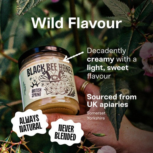 This Black Bee Spring honey is a soft set variety with a wonderfully creamy texture. It is foraged locally from rapeseed, hawthorn, and plum blossom across Somerset, Yorkshire, and Northamptonshire.