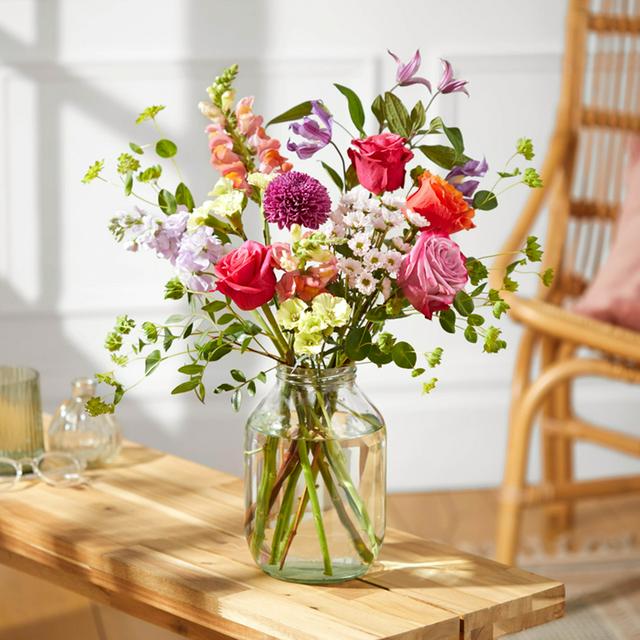 Brighten someone's special day with this vibrant Bloom & Wild bouquet, designed to look like a handful of colourful confetti. This arrangement features velvety roses, chrysanthemums, and snapdragons, making it a delightful birthday flower bouquet. Florists at Bloom & Wild have pre-arranged the flowers, simplifying the presentation process for you.