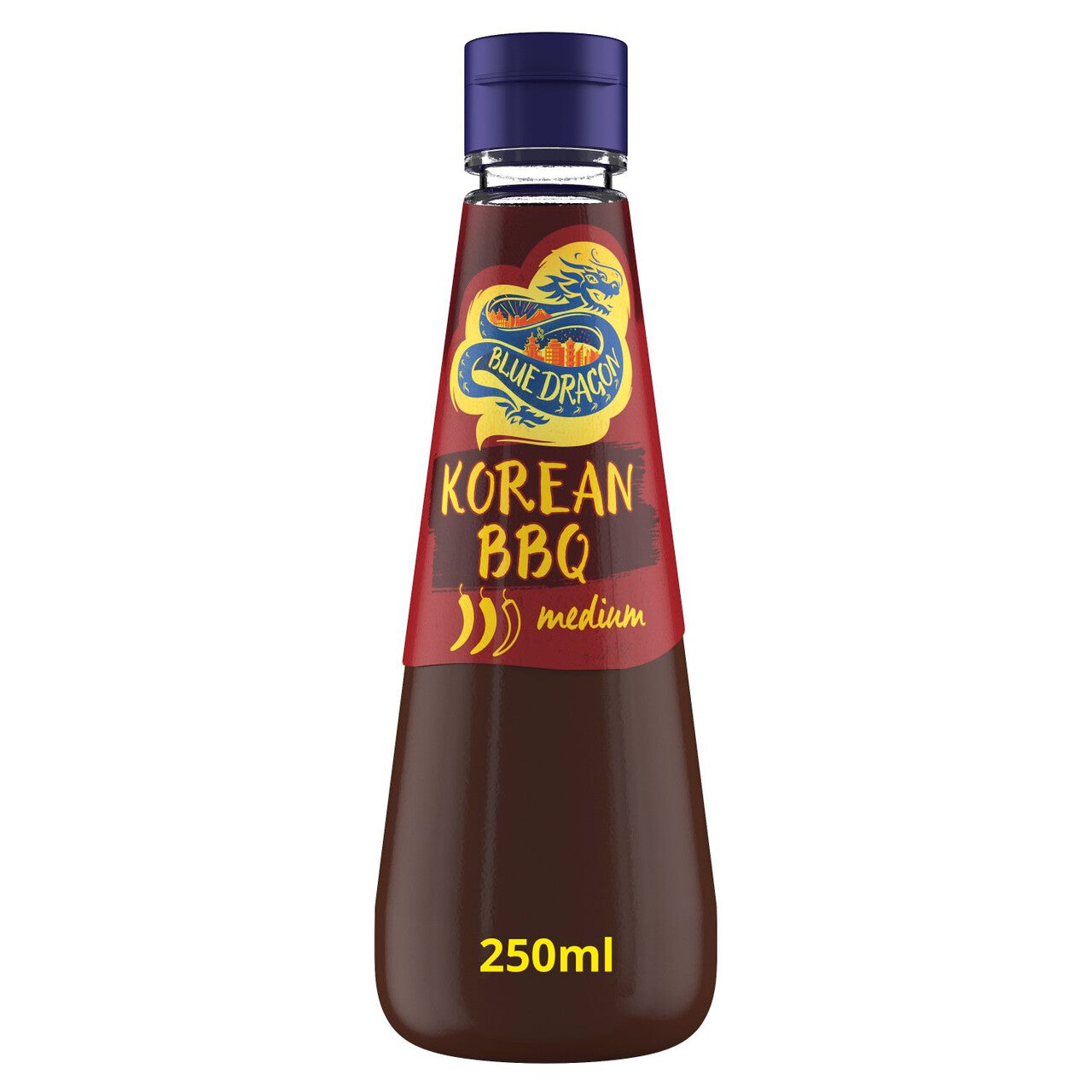 Blue Dragon Korean BBQ Sauce delivers an authentic, rich flavour profile perfect for your next meal creation at home. This 250ml bottle offers a convenient way to add sweet and sticky depth to various dishes you prepare. The sauce is clearly labelled as having a medium spice level, guided by three visual chilli indicators on the packaging for preference matching.