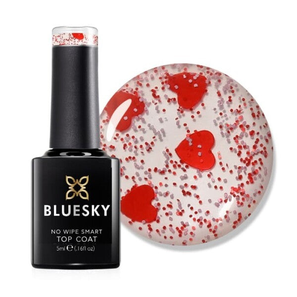 our bluesky queen of hearts top coat in 5ml will steal the show and your hearts inspired by the day of love this no wipe smart top coat is a stunning fine red glitter with red glitter flakes