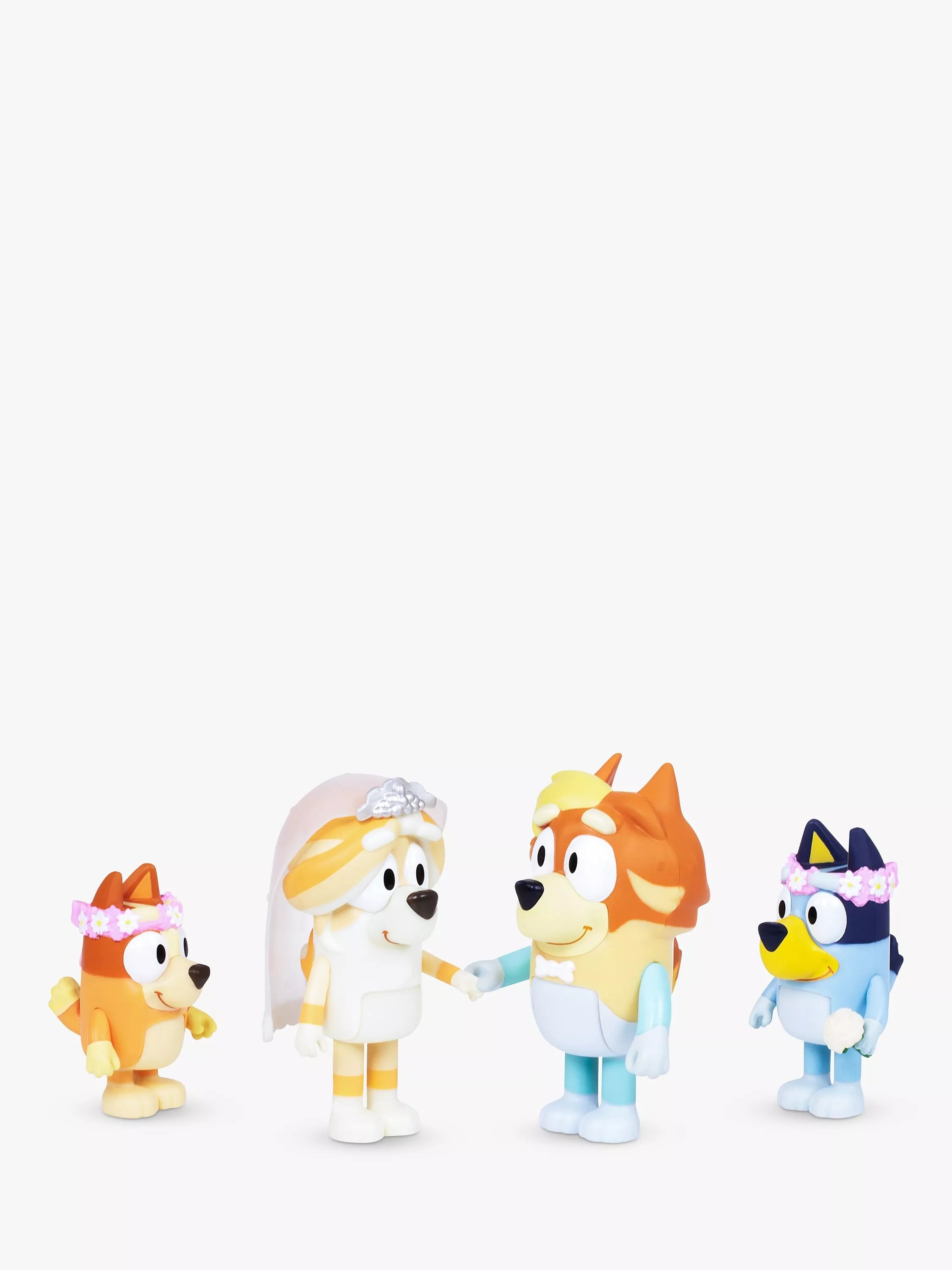 Bring home the fun and imaginative play of Bluey with this four piece Wedding Time figure set. Each figure has a posable body and adjustable arms, just the right size for pre-school hands to move and play with.