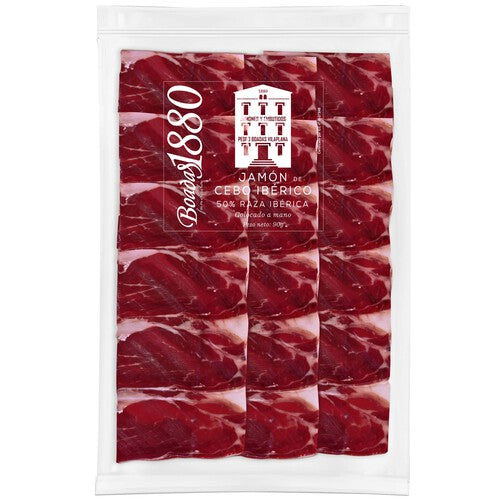 Read MoreBoadas Jamón de Cebo Ibérico 50% is a certified product made with Ibérico pig which showcases a cherry-red colour, excellent marbling, and a characteristic sheen in both the lean and fat. Its smooth, mild, and sweet flavour is best enjoyed thinly sliced at room temperature, accompanied by fresh bread, olive oil, or paired with a nice red wine. Boadas beginnings trace back to a small workshop in Girona, where the owner, Pedro Boadas Vilaplana, made and cured hams together with his wife and children. The family grew and the prestige of their hams and charcuterie enabled them to progress and become pioneers in their field at the beginning of the 20th century. Five generations later, the Boadas family remains loyal to their origins, perpetuating traditional recipes passed down to each generation, in order to preserve the traditional production of their Serrano ham and other noble cuts, obtaining outstanding taste, aroma and texture.