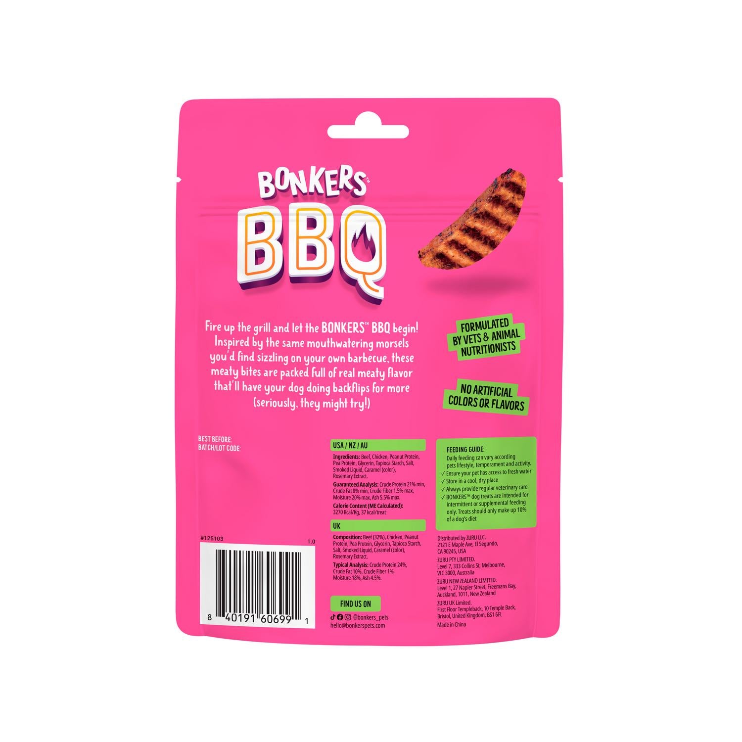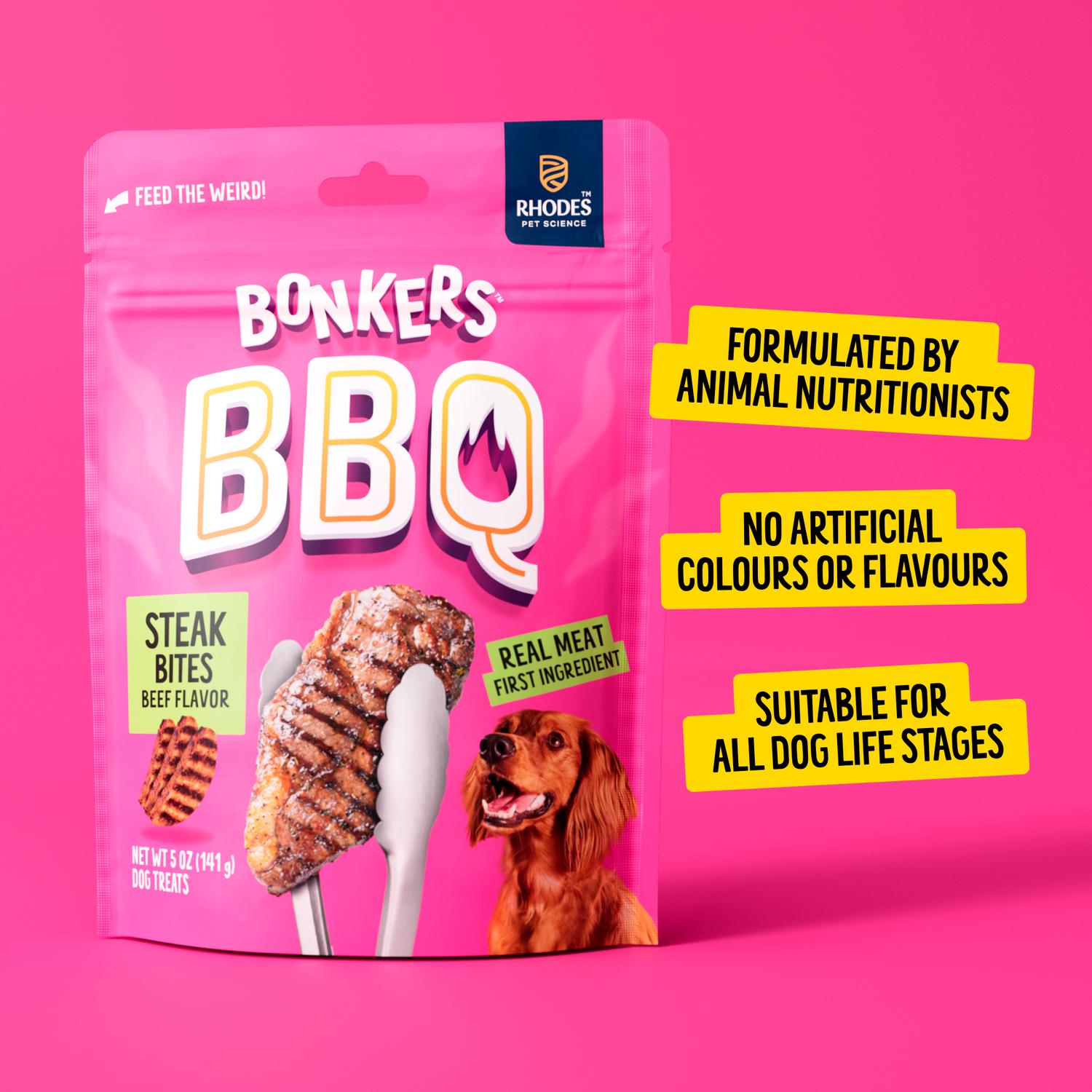Fire up the grill and let the BONKERS BBQ begin! Inspired by the same mouthwatering morsels you'd find sizzling on your own grill, these steak cuts are packed full of real meaty flavour that'll have your dog doing backflips for more (seriously, they might try!) Carefully formulated by animal nutritionists, these tasty steak bites have real beef as the first ingredient, with no artificial colours or flavours.