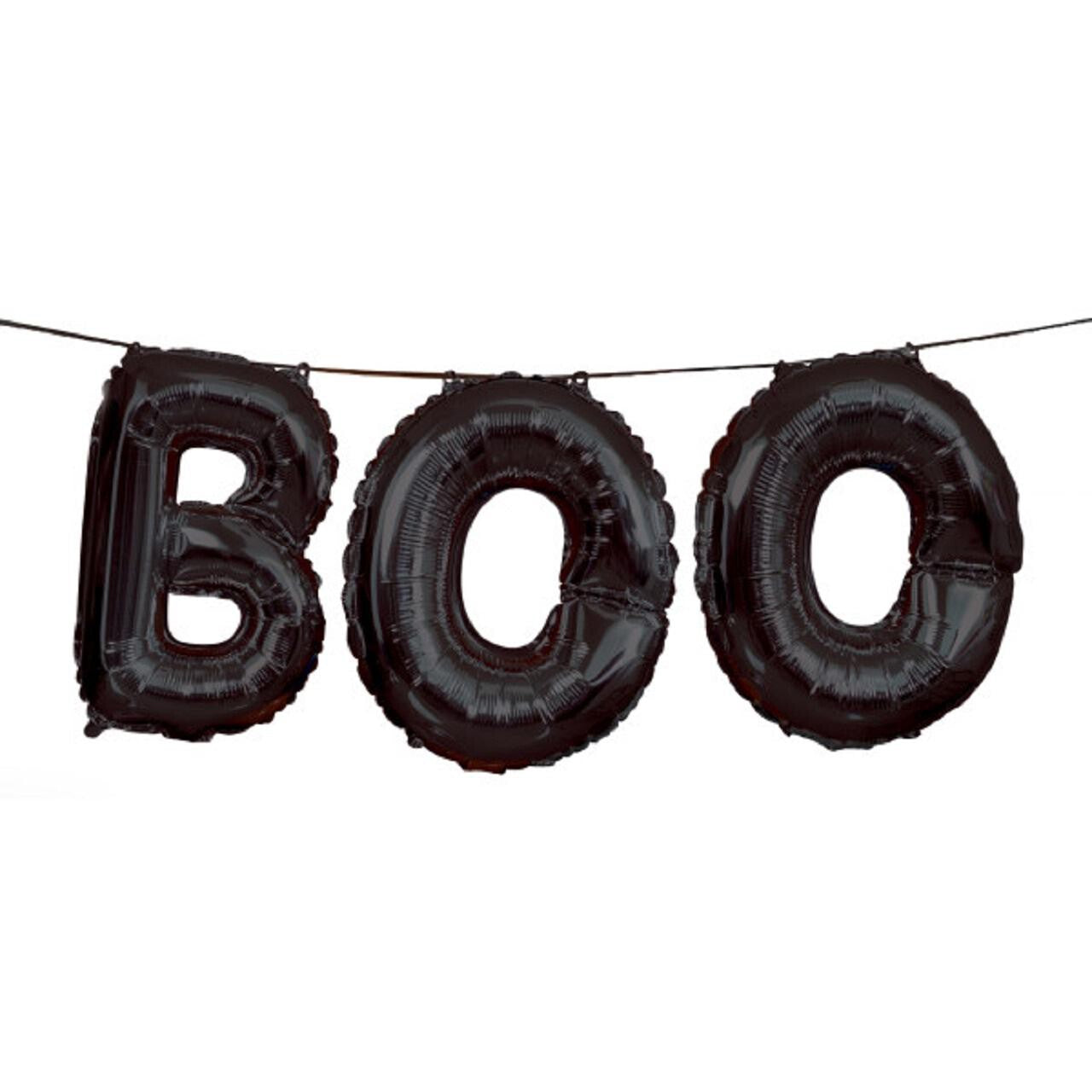 • Includes three giant black foil letter balloons spelling 'BOO'.