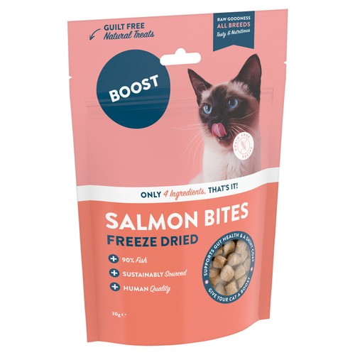 Offer your cat a highly nutritious snack with these Boost Pet Freeze Dried Salmon Treats. The gentle freeze-drying process is specifically used to help preserve essential nutrients within the ingredients.