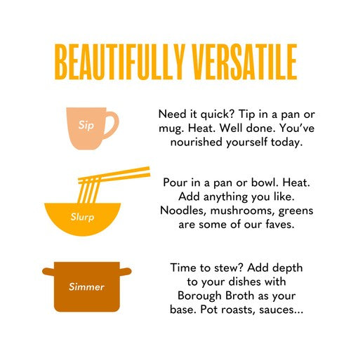 Seasoned just right, our broths are designed for sipping, slurping or cooking. There are plenty of recipes on boroughbroth.co.uk if you're in need of inspiration.