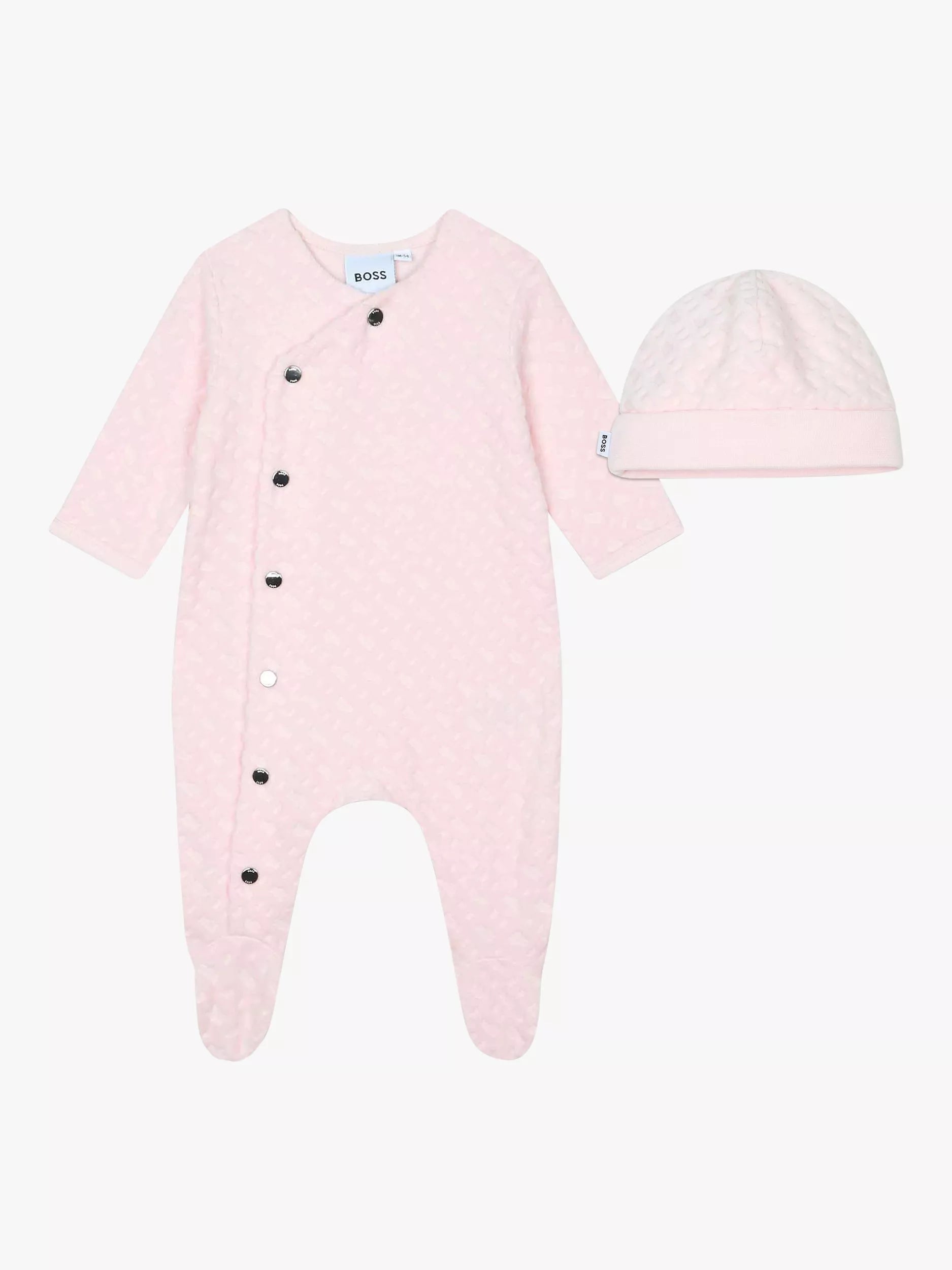 Wrap your little one in luxurious comfort with this adorable BOSS Baby sleepsuit and hat set. Crafted from a soft organic cotton blend jacquard velvet, it's perfect for delicate skin and sweet dreams.