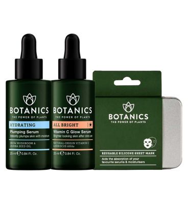 This Botanics Glowing Skin Set offers a curated, plant-powered routine designed for enhanced radiance and moisture retention. It includes two concentrated serums and a reusable silicone mask to maximise treatment efficacy. This collection specifically focuses on delivering deep hydration and noticeable skin brightening benefits through natural actives.