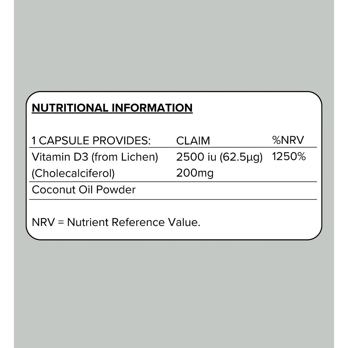 Coconut Oil, Brown Rice Flour, Capsule Shell (Vegetable Cellulose), Vitamin D3 from Lichen, Rice Extract, Rice Fibre.