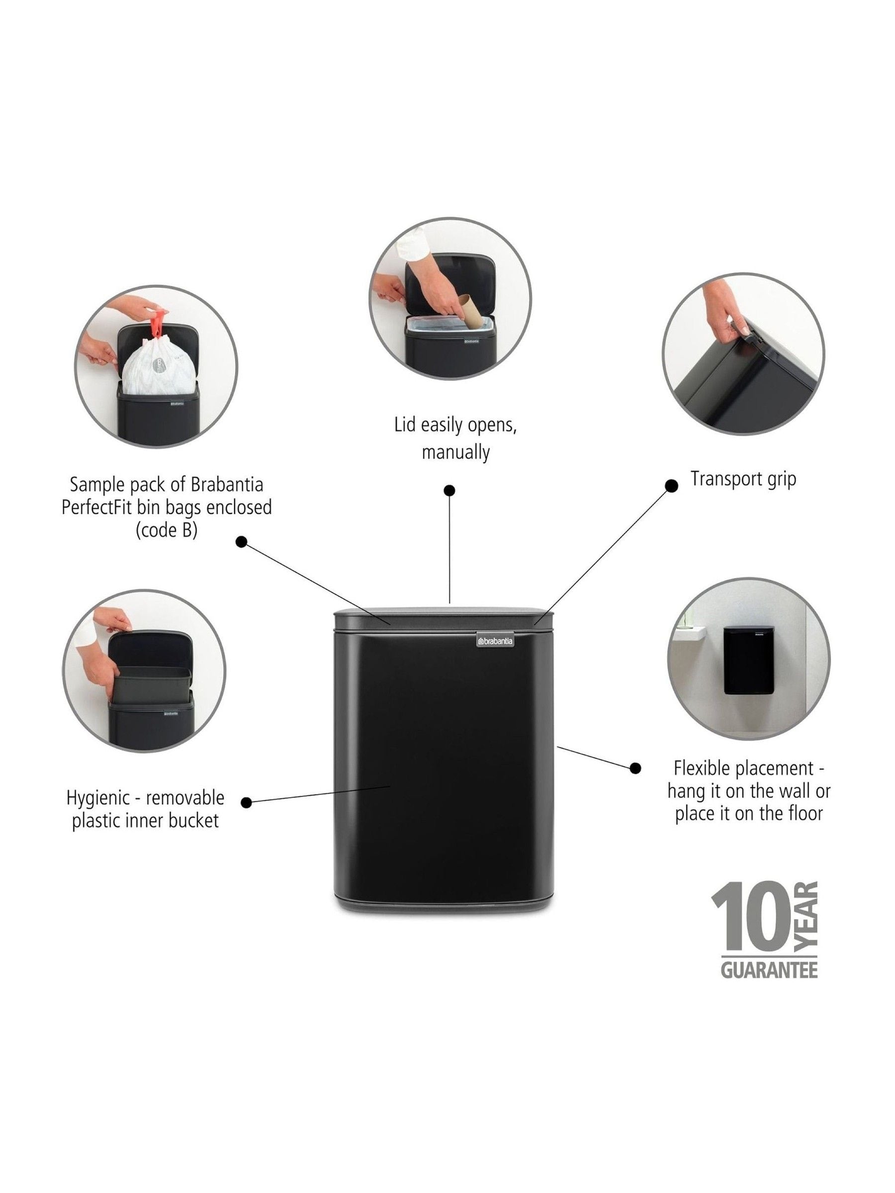 Not too big, not too small, but just right. That's the Brabantia Bo Waste Bin 7 litre for you! Put it in a corner, or hang it on the wall. Wherever you like, because you can lift the lid easily from the left, right and front of the bin. So no more bending over backwards to put something in the bin. A fairytale bin!