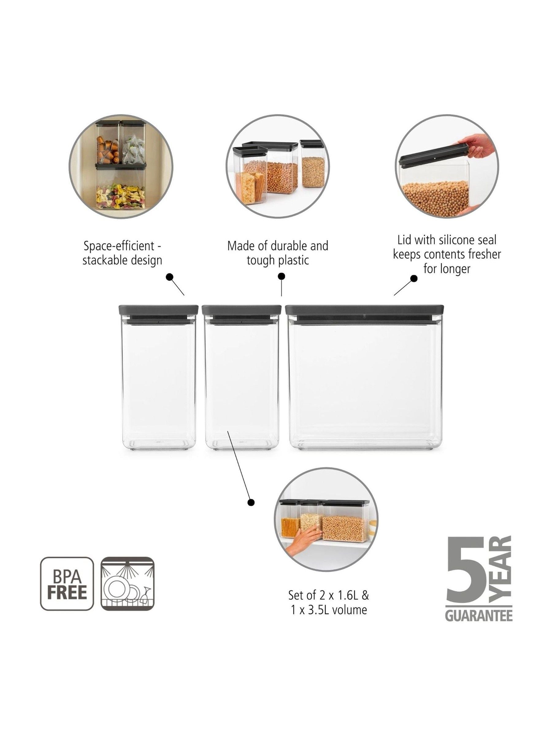 Keeping an organised kitchen can be challenging at times. Brabantia is happy to be of help with this set of three plastic Tasty+ Stackable Canisters - one 3.5L and two 1.6L containers. Their strong and space-efficient design shows contents at a glance. Ideal to keep stock in sight and food fresh for longer. Triple organised. Set of 3 canisters (2 x 1.6L + 1 x 3.5L). Space-efficient. Stackable design. Keeps contents fresher for longer. Lid with silicone seal. Multi-talent. For dry and wet foods. Durable. Made of tough plastic. Hygienic. Seamless body, no rims. Easy to clean. Dishwasher safe. Problem-free use. 5-year guarantee and service. Size: ONE.