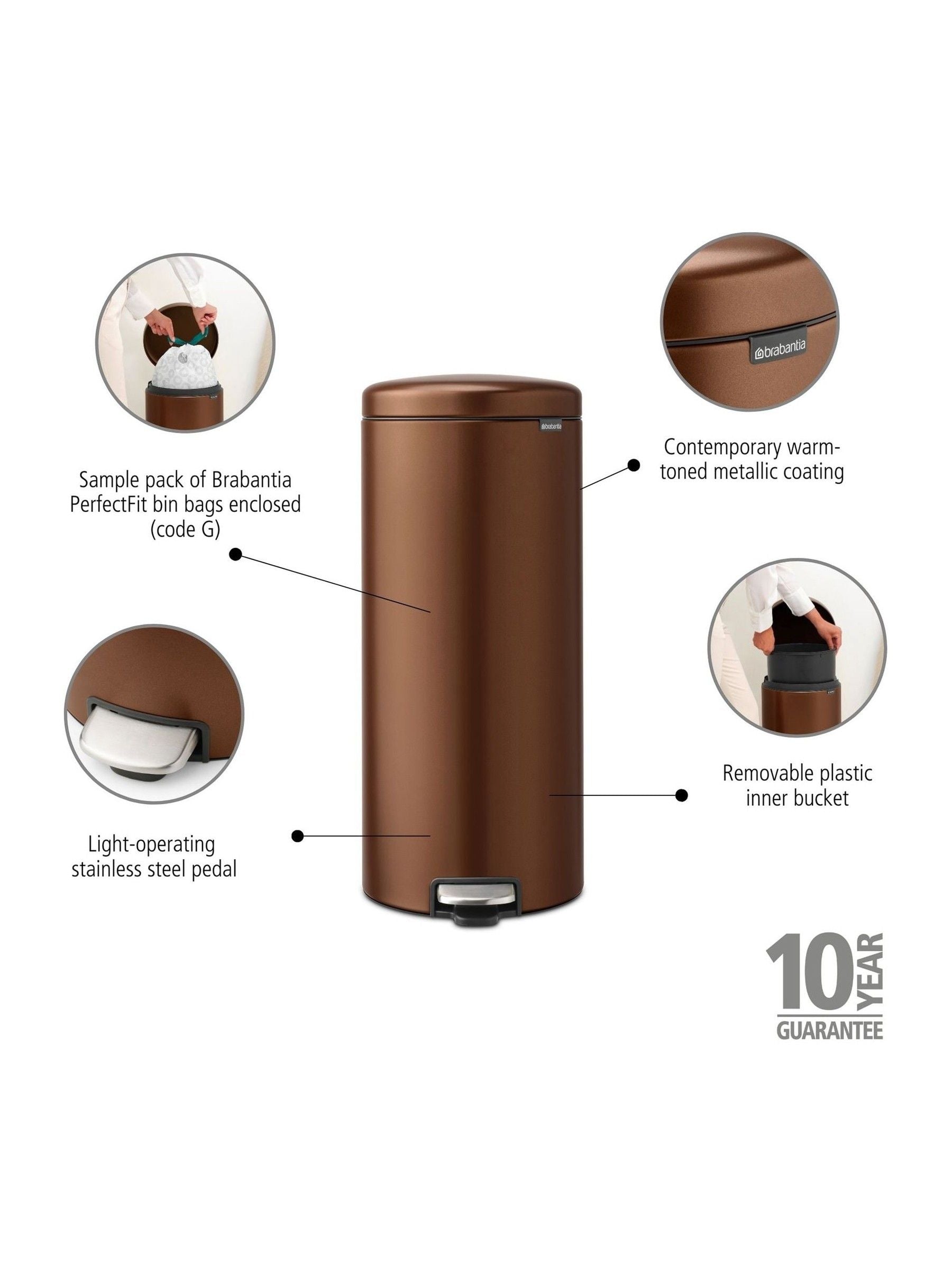 Brabantia’s NewIcon Pedal Bin (30L) is even more iconic with its warm-toned metallic coating and stylish stainless steel pedal. This stylish bin adds a sense of luxury to any room, standing strong thanks its non-slip base and anti-tilting block. Its unique soft-closure feature ensures a smooth closure too. And of course the NewIcon is easy to open, odour-proof, hygienic, and easy to keep clean. 30 litres of timeless design.