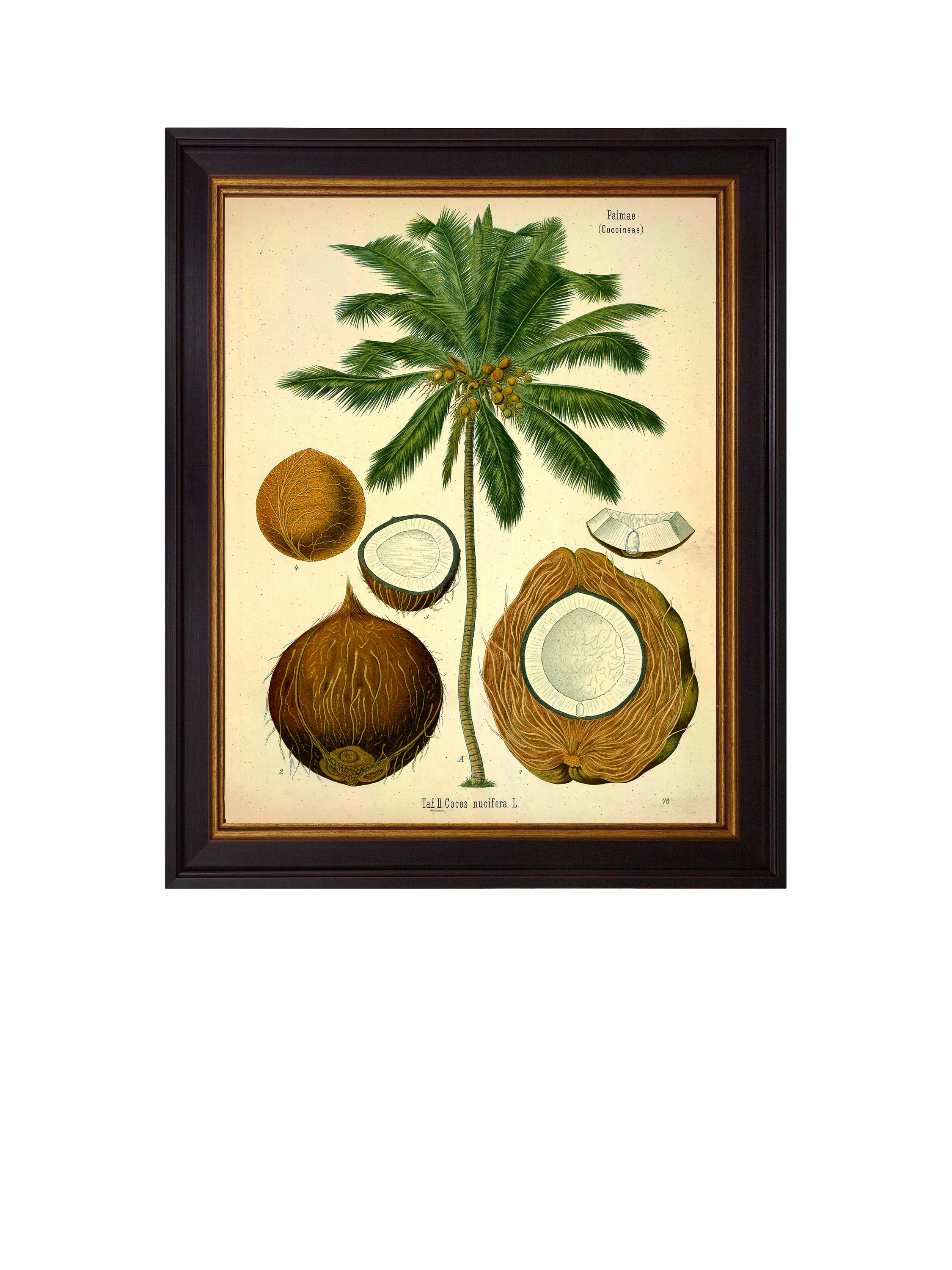 A vintage-style print illustration of a coconut palm tree. Made in the UK with an aged cream window mount and float-glass glazing. Presented in a luxury black frame with an inner aged-gold rim for an antique-inspired, high-quality finish. Ready to hang on your wall.