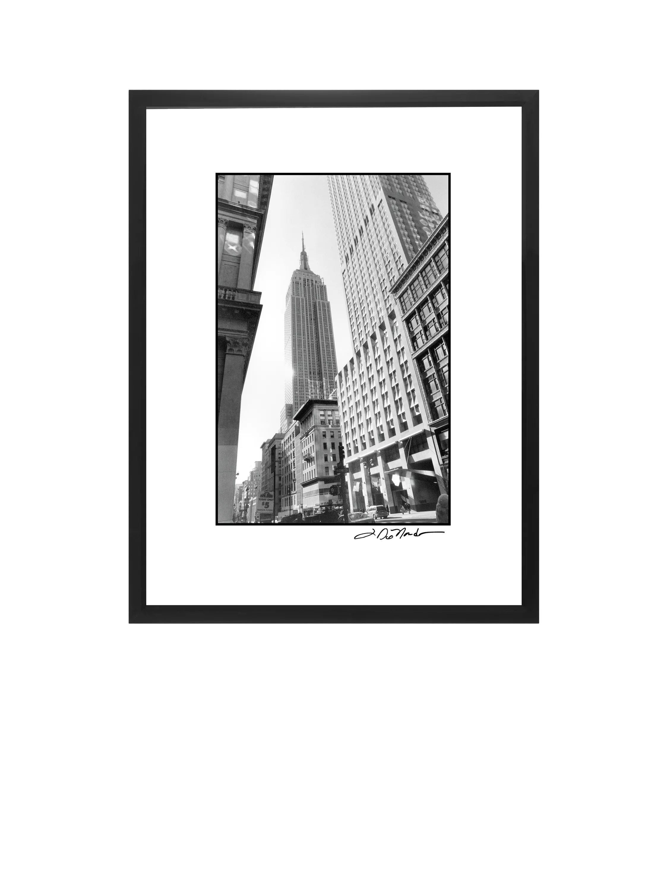 A black and white photograph of Manhattan's iconic Empire State Building. Printed on 250gsm satin photo paper and set within a 2600-micron thickness mountboard, creating a luxury and high-quality finish.