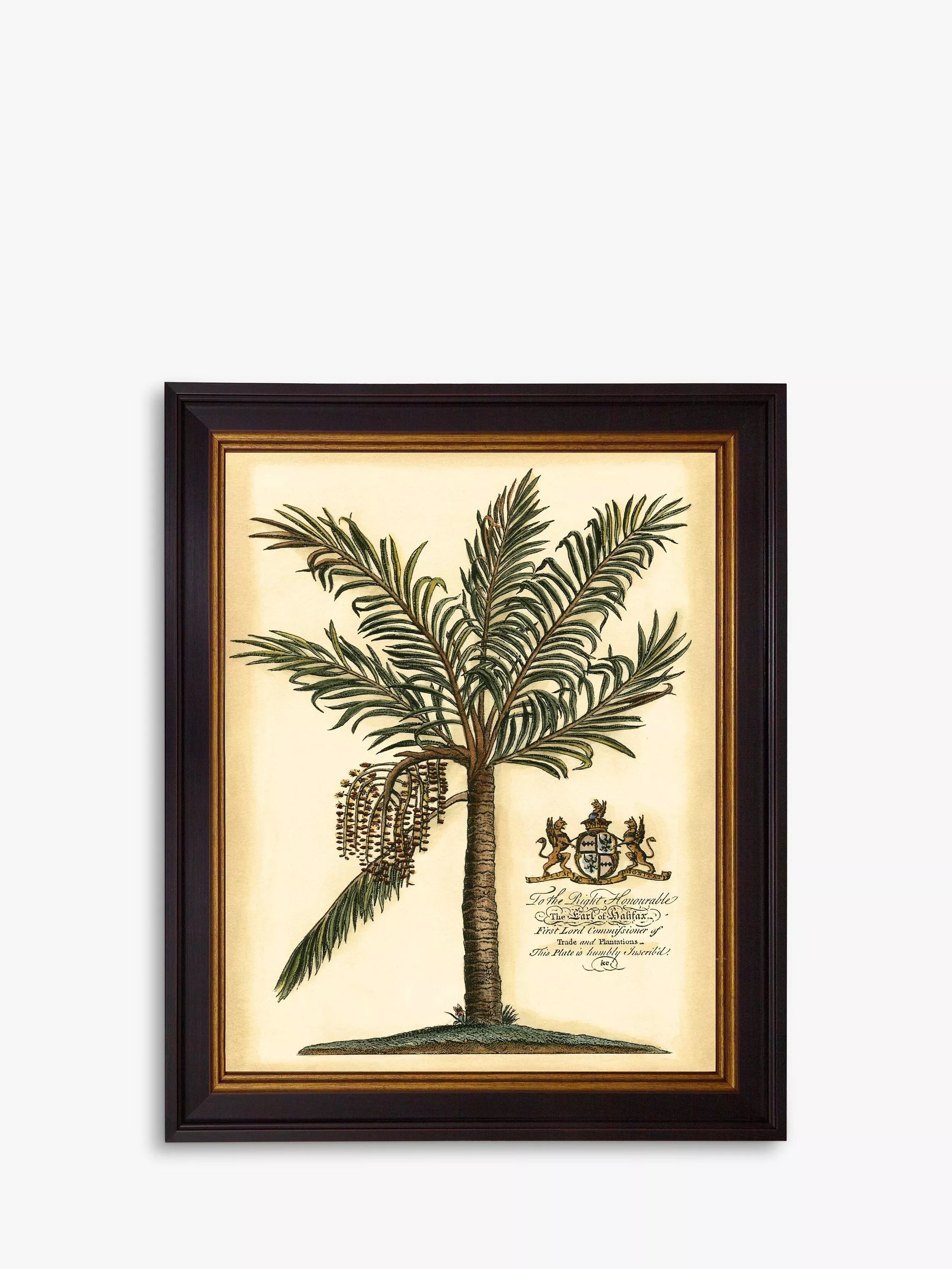 A vintage-style book print illustration of a palm tree, with a dark wood-effect frame and an inner gold rim.