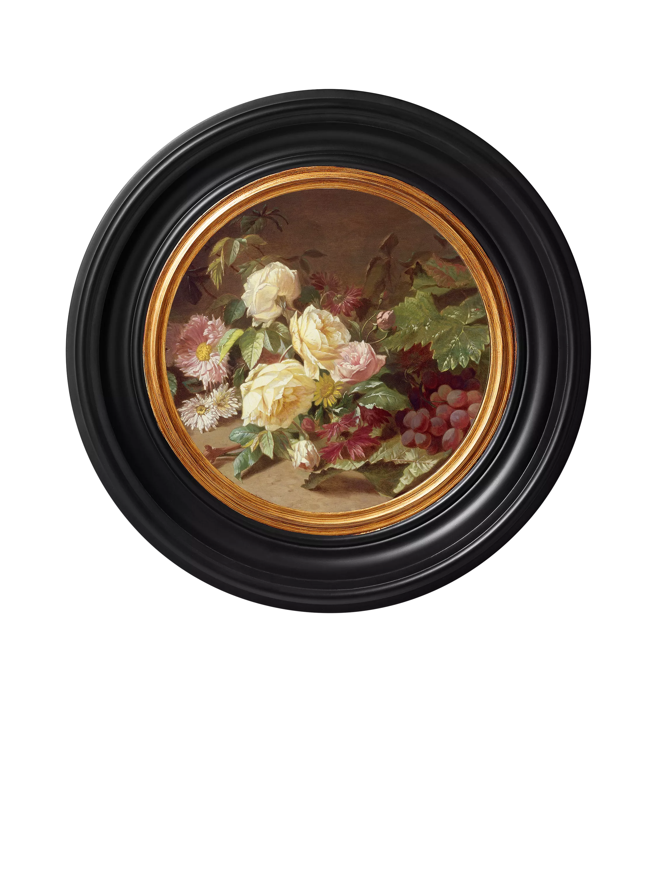 A vintage-style still life print. Made in the UK, with the use of both up-to-date technology and skilled craftsmen, this unique and high-quality picture captures all the colour, craquelure, texture and character of an original painting. Set in a round wooden, antique-style black and aged-gold frame, ready to hang on your wall.