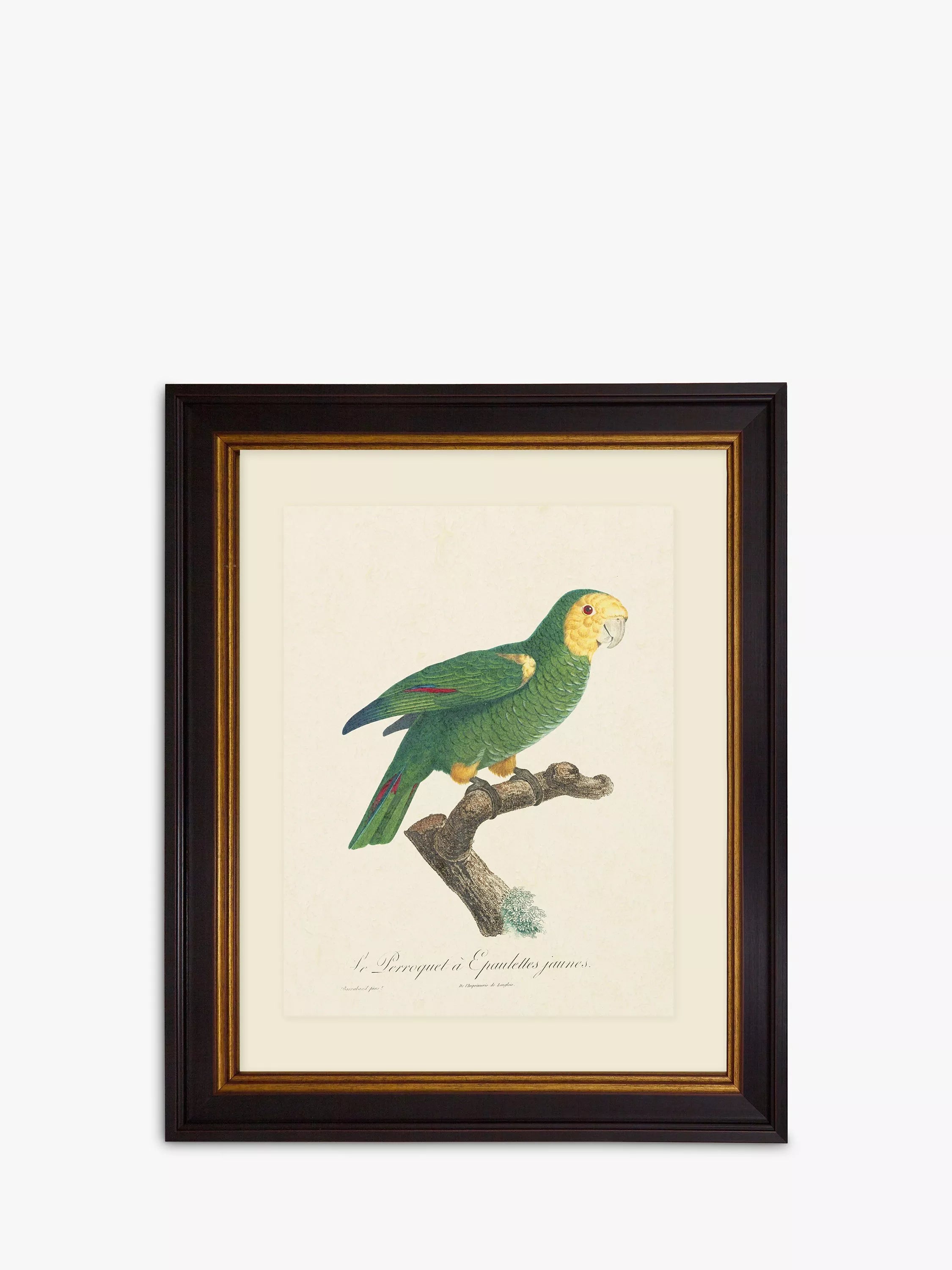 A vintage-style print illustration of a parrot. Presented with a mount and a dark wood-effect frame with an inner gold rim.