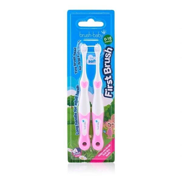 - Double pack FirstBrush™ baby toothbrush in pink. SOFT BRISTLES TOOTHBRUSH: A long handle is comfortable in adult hands. The tiny baby toothbrush head suits small mouths and first milk teeth. The soft bristles are gentle on delicate teething gums. FORM GOOD DENTAL HABITS: Brush