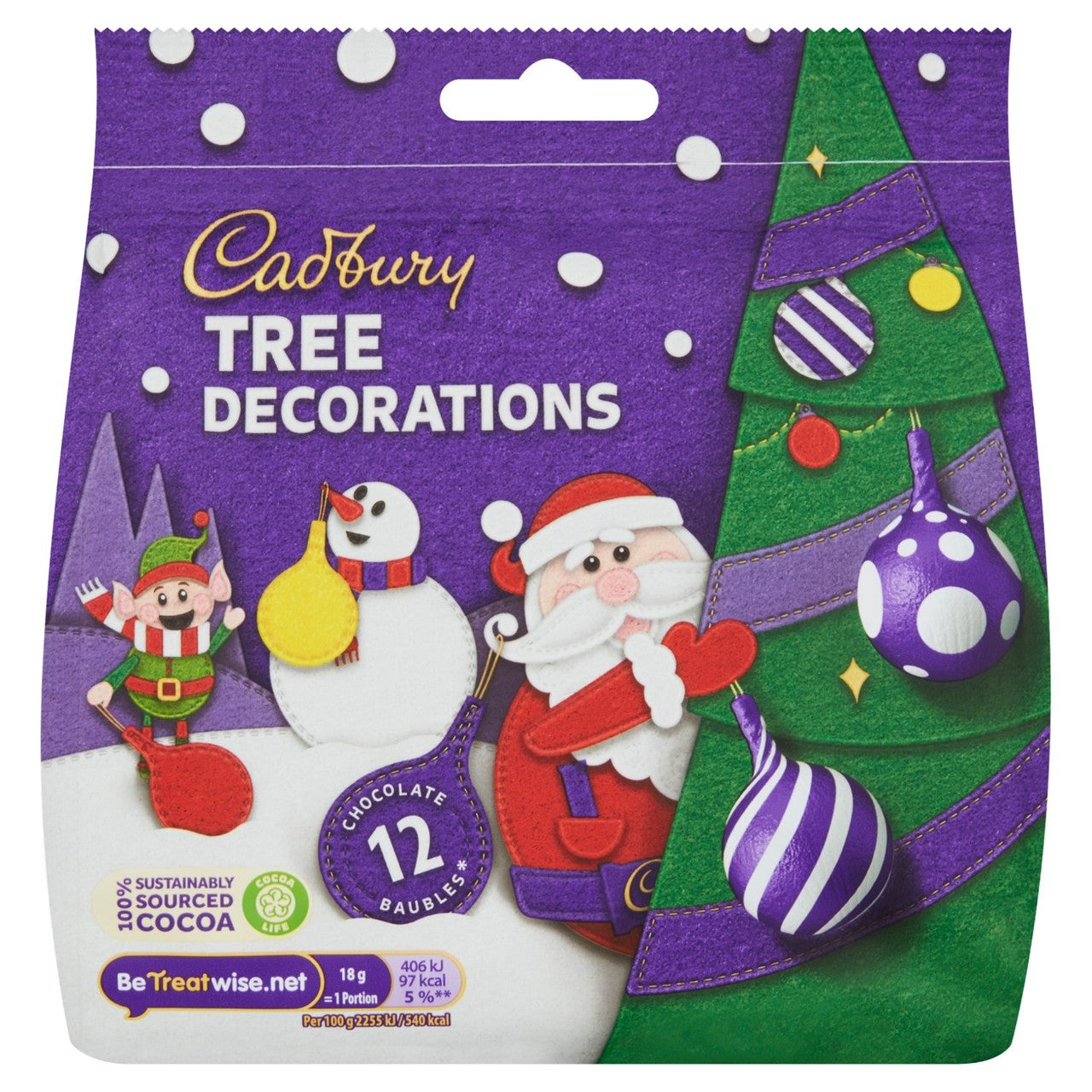 • Twelve individual Cadbury milk chocolate baubles are included.