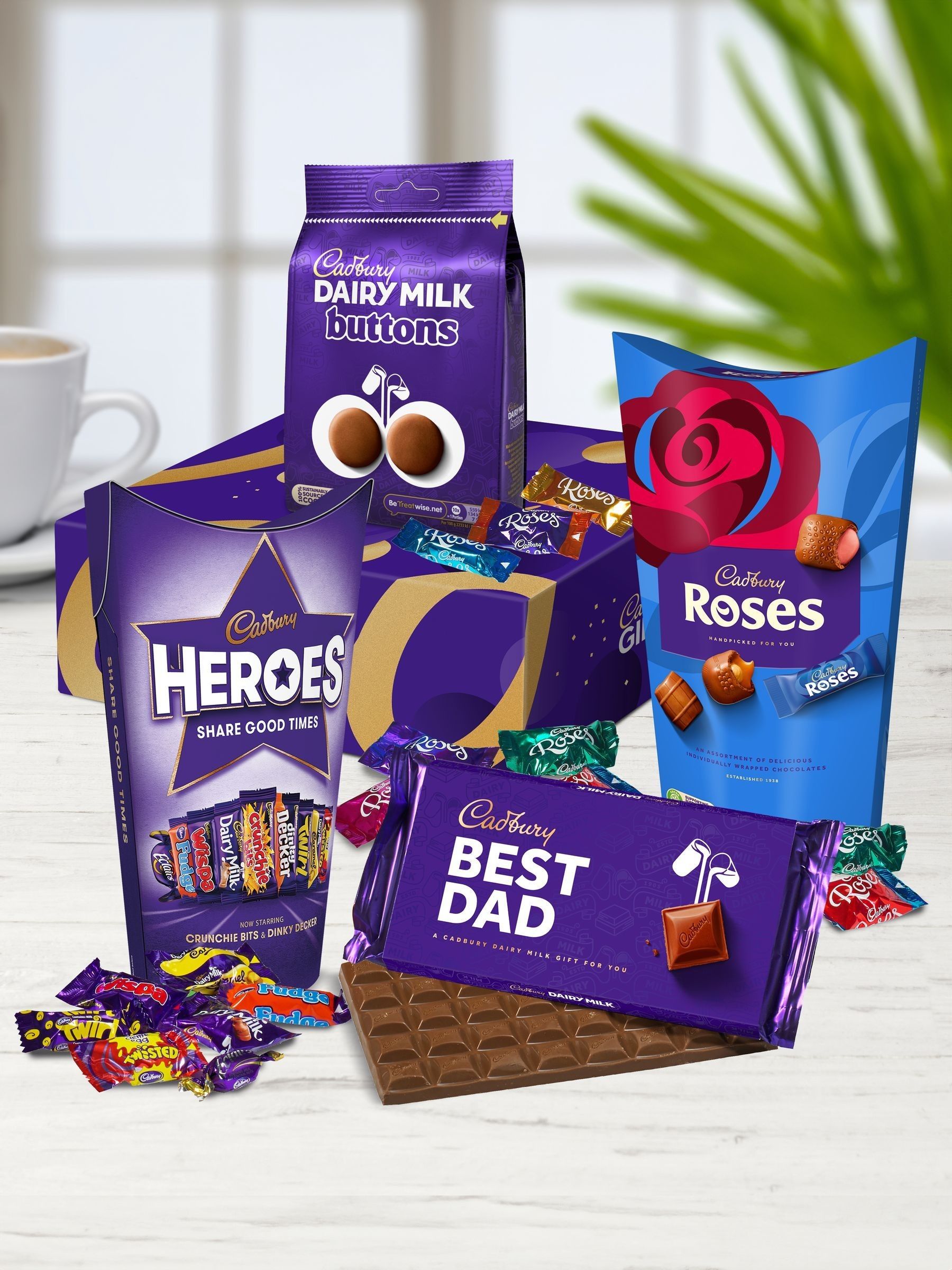 Contains; 1 x Cadbury Dairy Milk Chocolate Bar 110g with Best Dad Sleeve, 1 x Cadbury Roses Chocolate Carton 290g, 1 x Cadbury Heroes Chocolate Carton 290g, 1 x Cadbury Dairy Milk Chocolate Buttons Bag 100g.