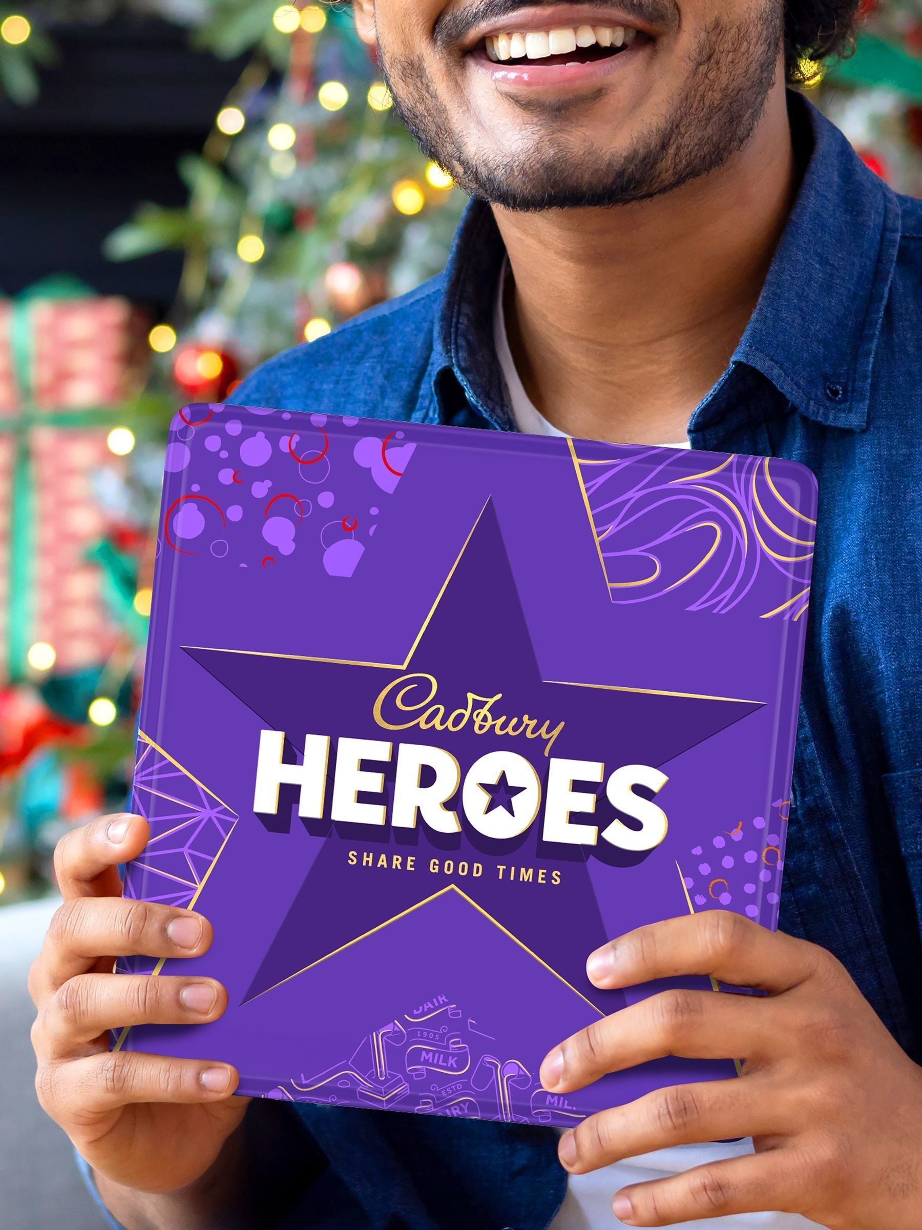 Cadbury Heroes Chocolate collectible gift tin. NEW design for 2025, a stunning gift tin, filled to the brim with individually wrapped milk chocolates and toffees.