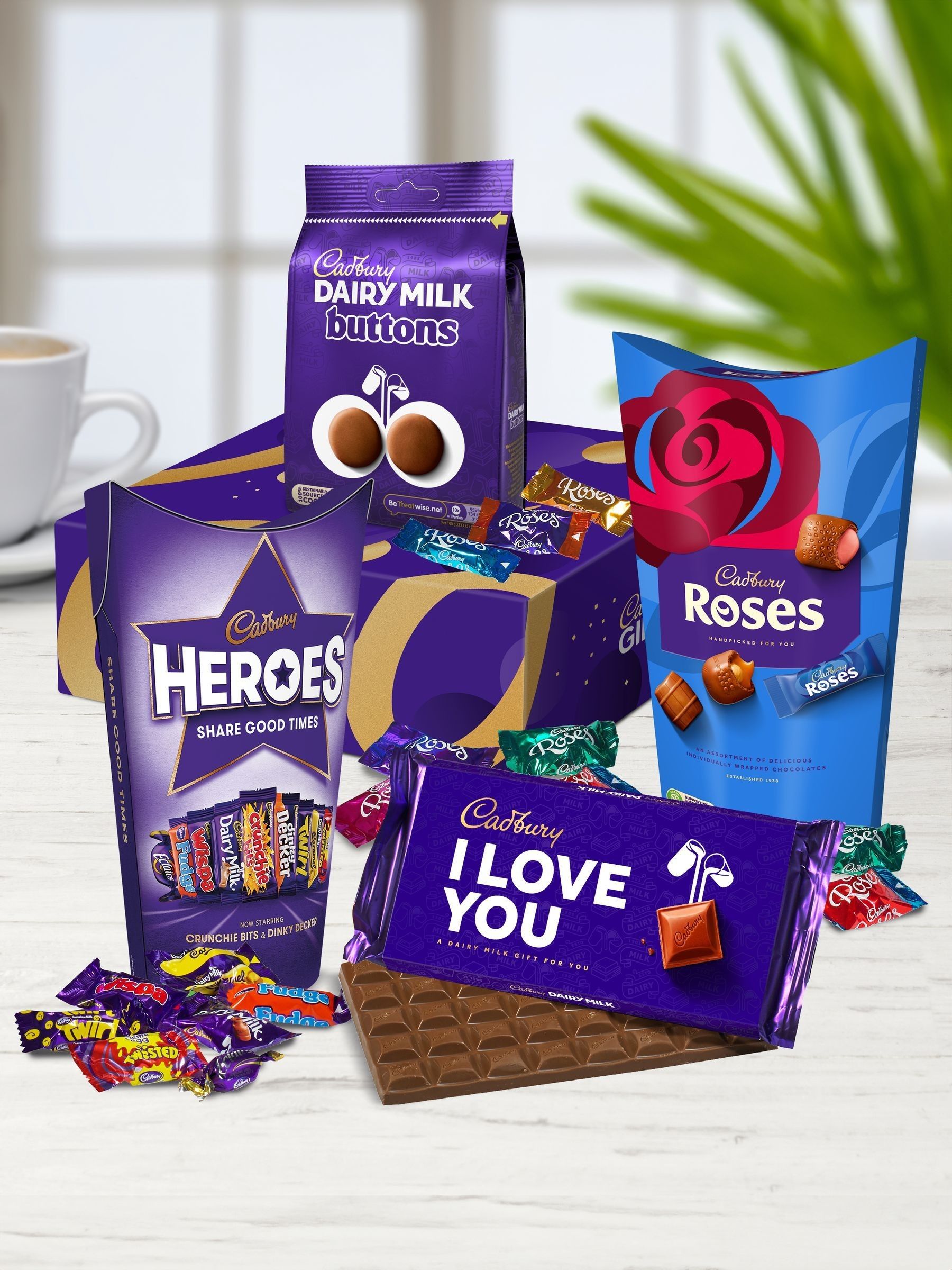 Contains; 1 x Cadbury Dairy Milk Chocolate Bar 110g with I Love You Sleeve, 1 x Cadbury Roses Chocolate Carton 290g, 1 x Cadbury Heroes Chocolate Carton 290g, 1 x Cadbury Dairy Milk Chocolate Buttons Bag 100g.