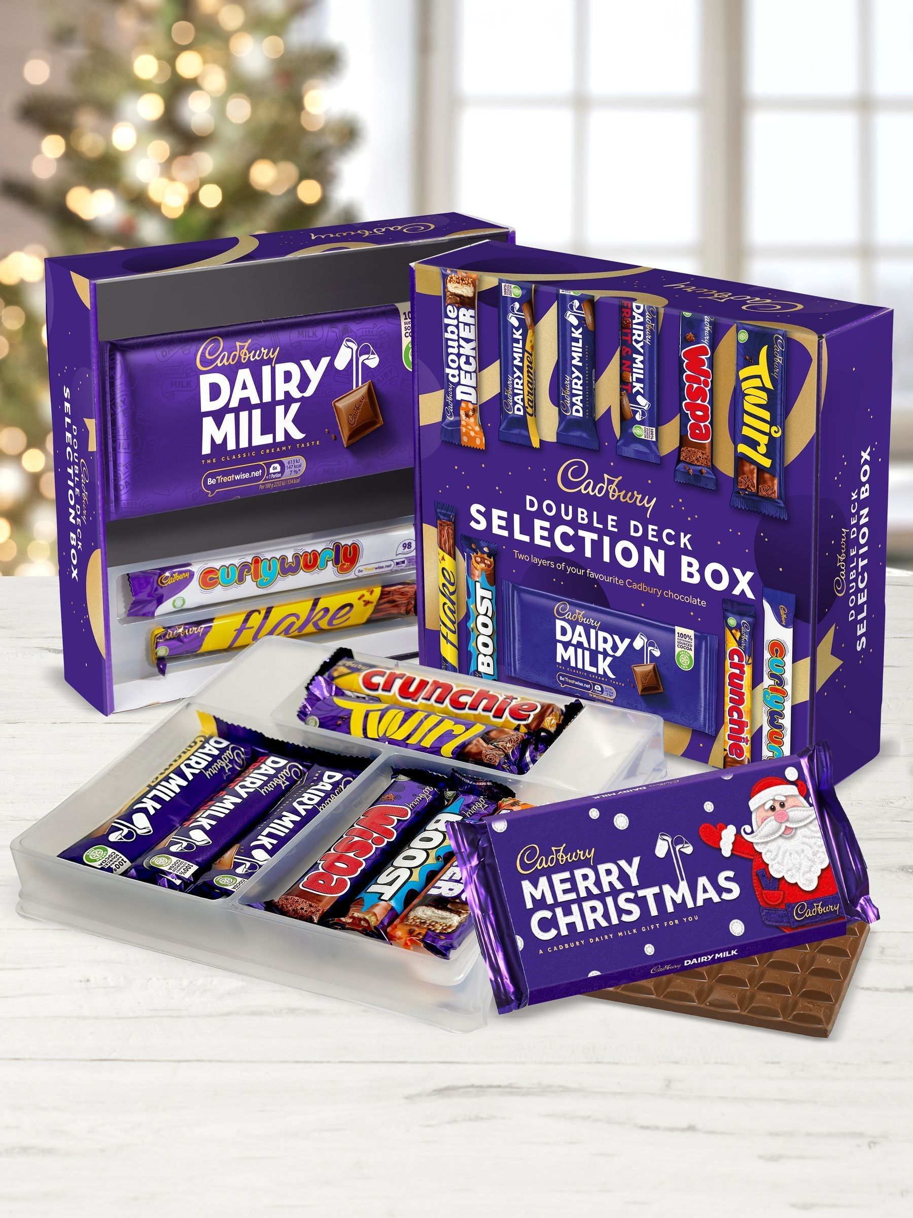 Cadbury Christmas Double Deck Selection Box Gift contains. Cadbury Dairy Milk Bar 110g with Merry Christmas Cardboard Sleeve. Cadbury Dairy Milk Chocolate Bar 110g. Cadbury Dairy Milk Chocolate 45g. Cadbury Diary Milk Caramel Bar 45g. Cadbury Dairy Milk Fruit & Nut Bar 49g. Cadbury Crunchie Bar 40g. Cadbury Twirl Bar 43g. Cadbury Flake Bar 32g. Cadbury Curly Wurly Bar 21.5g. Cadbury Wispa Bar 36g. Cadbury Boost Bar 48.5g. Cadbury Double Decker Bar 54.5g.