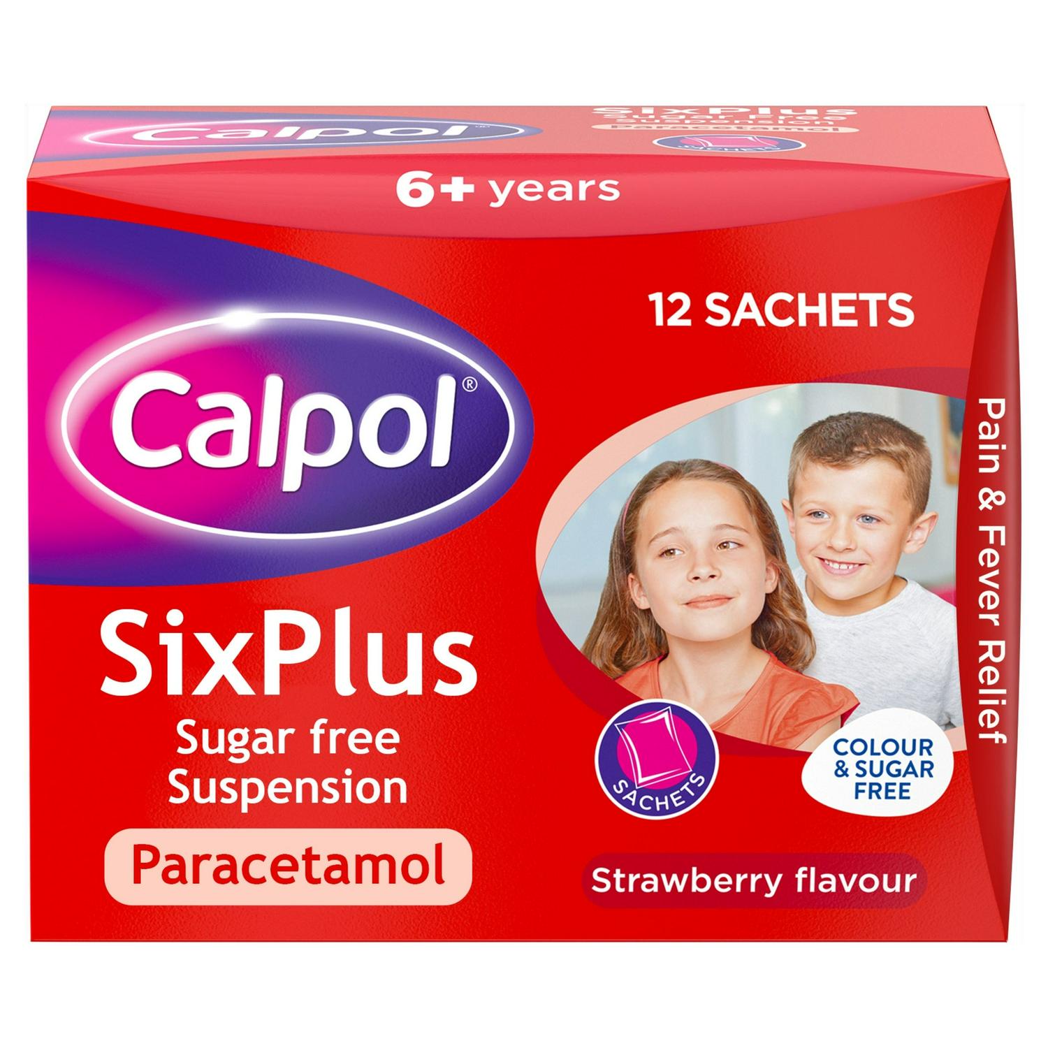 CALPOL® Six Plus Sugar Free Suspension Sachets are strawberry flavoured oral suspension sachets used for the relief of: Fever (raised temperature), post-immunisation fever, cold and flu symptoms, teething, headache, sore throat, earache and other aches and pains.