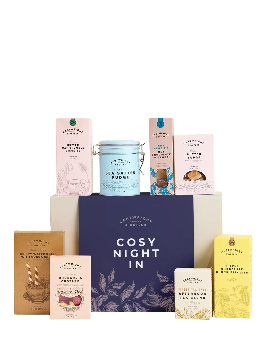 Grab the blankets, light the fire, pop your favourite film on the TV and snuggle up with Cartwright & Butler's Cosy Night in Treat Box. Containing all the essentials for a relaxed, indulgent evening, the Cosy Night in Treat Box contains a wide variety of treats for all the family to enjoy. Featuring delicious hot drinks including our classic afternoon tea blend, and milk hot chocolate stirrer, irresistible when stirred into warm milk. The set offers a variety of biscuits and sweet treats, including Triple Chocolate Chunk Biscuits, Crispy Wafer Rolls, Butter Oat Crumbles and Sea Salted Fudge.