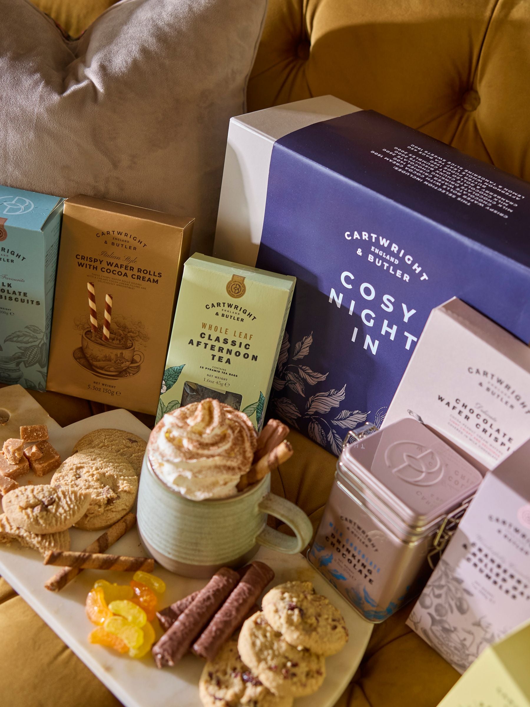 Grab the blankets, light the fire, pop your favourite film on the TV and snuggle up with Cartwright & Butler's Cosy Night in Treat Box. Containing all the essentials for a relaxed, indulgent evening, the Cosy Night in Treat Box contains a wide variety of treats for the full family to enjoy. The gift set features delicious hot drinks including our Classic Afternoon Tea Blend, and the brand new Milk Chocolate Drinking Chocolate, smooth flakes of milk chocolate, irresistible when stirred into warm milk. The set offers a variety of biscuits and sweet treats, including Milk Chocolate Chunk Biscuits. Chocolate Wafer Crispies. Chocolate Wafer Rounds. Butter Fudge. Cranberry Crumbles and Lemon & Tangerine Slice Sweets. The gift set is presented in a stylish grey gift box, complete with a "Cosy Night In" sleeve.
