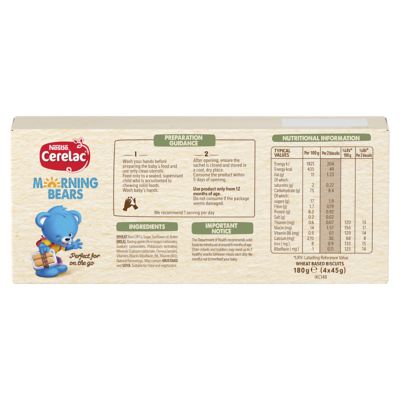 Read MoreCerelac® Morning Bears baby snacks are tasty wheat-based biscuits. There are no artificial flavours, colours or preservatives*. This baby finger food snack is designed to be easy for little hands to grab and are perfect on the go. Suitable from 12 months. Suitable for Halal and vegetarians. Morning Bears biscuits are a snack product and should be consumed as part of a varied and balanced diet.