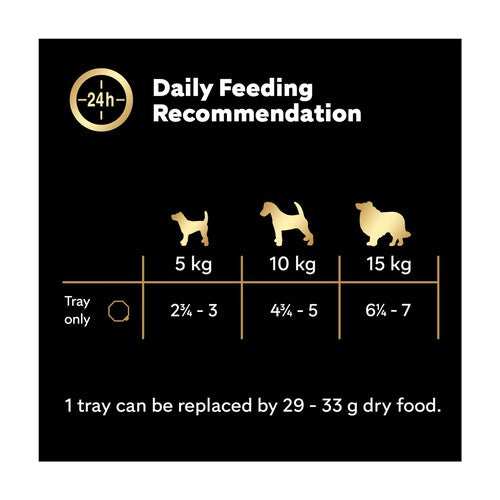 Feeding instructions: A 5 kg dog needs 2 3/4 - 3 trays daily, a 10 kg dog needs 4 3/4-5 trays daily, a 15 kg dog needs 6 1/4-7 trays daily. 1 tray can be replaced by 29-33 g dry food. Account for the calories coming from treats. Feeding amounts are intended as guidelines only. Adjust the amount of food according to the age, size and activity level of your dog. For more detailed information, please visit our website. Fresh water should always be available. Serve at room temperature, surplus food can be chilled for up to 2 days.
