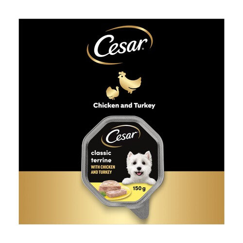 Read MoreCesar Dog Food Classic Terrine with tender chicken and turkey dog food in jelly is a succulent, hearty and 100% complete meal, carefully prepared with healthy, natural ingredients that your dog will simply adore. A complete dog food to ensure your dog enjoys a whole host of nutrients to keep them happy and healthy, all in a tasty wet dog food.