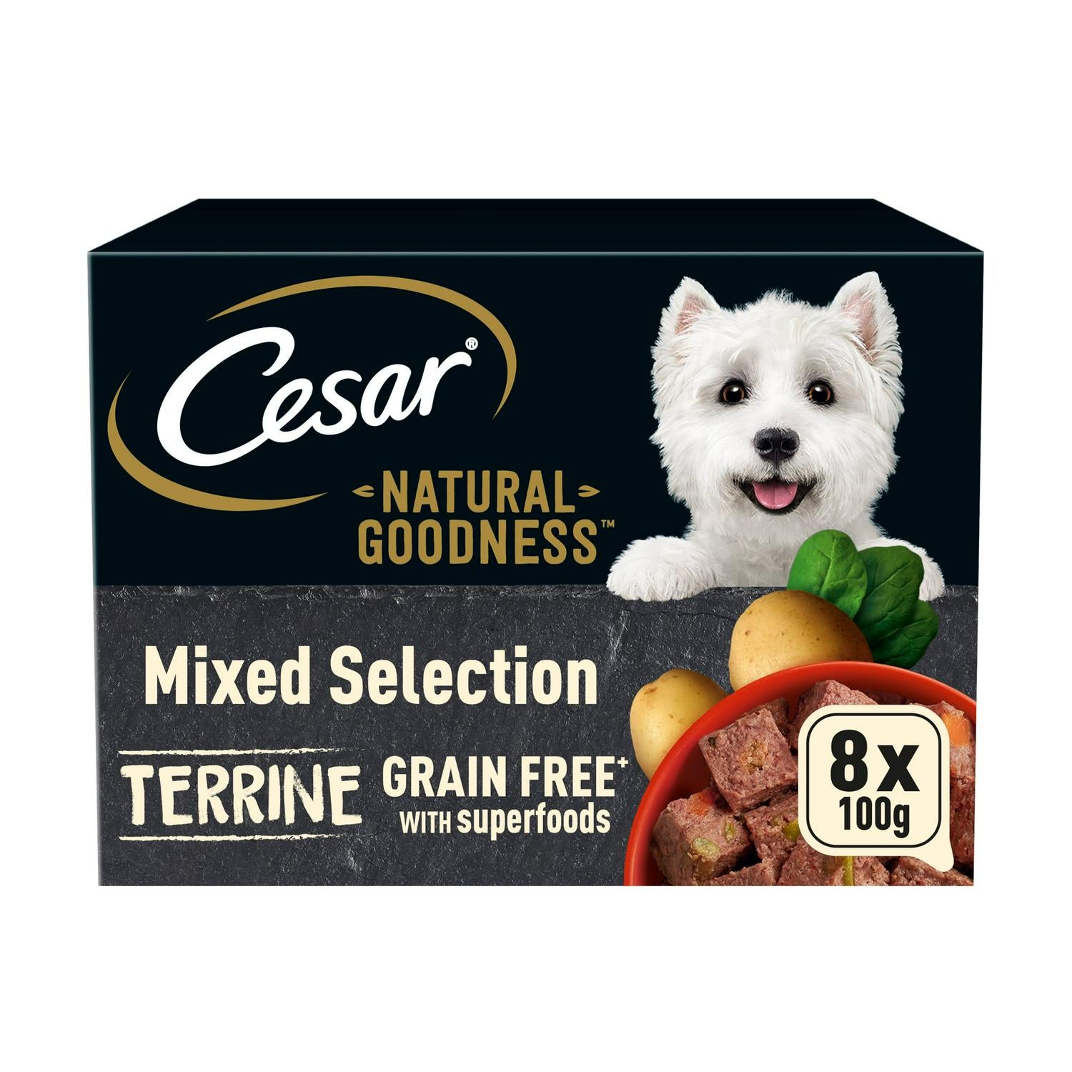 Cesar Natural Goodness grain-free dog food with superfoods in terrine that come in a variety of flavours. Dog food trays that come with superfoods and prebiotics. Adult dog food with poultry, garnished with potatoes, cranberries and linseed oil. Dog food with turkey, garnished with peas, spinach and red pepper. Grain free dog food with beef, garnished with green beans, carrots and blueberries.