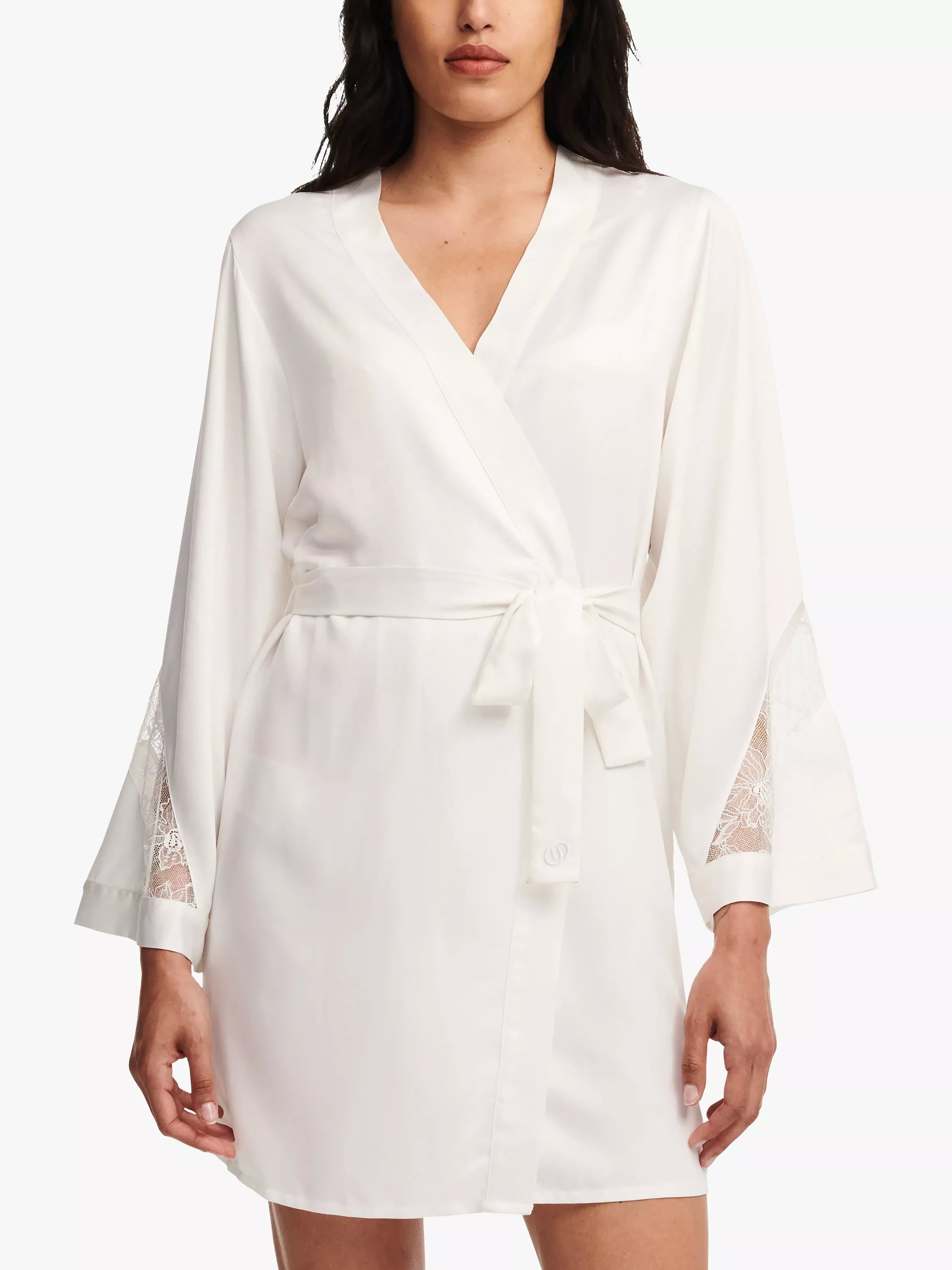 This sultry satin style features floral leaver lace inlay at the end of the bell sleeves. Wear open or closed with the satin loops and belt.