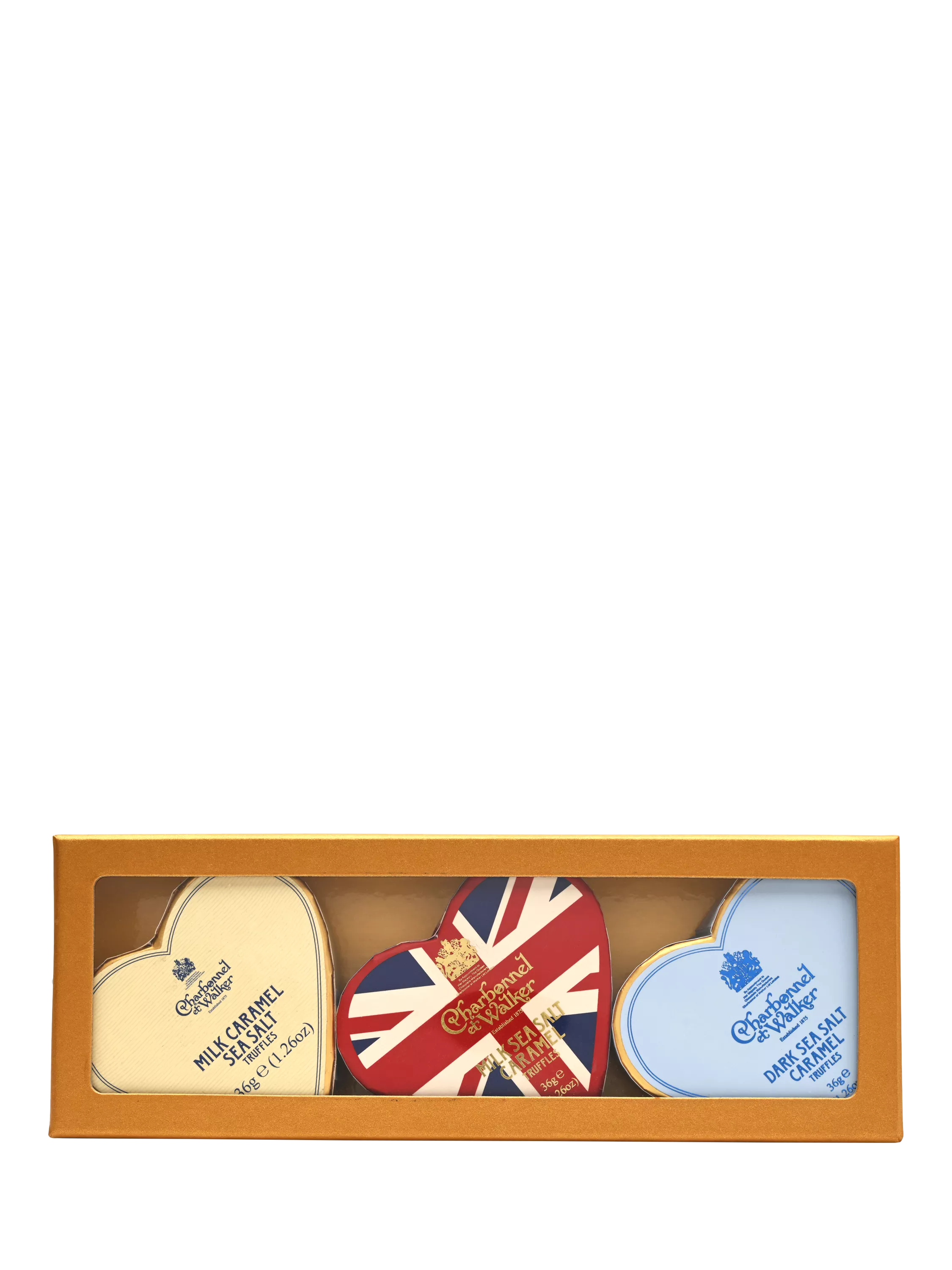 Three delightful mini hearts are scrumptiously filled with: Milk Sea Salt Caramel Truffles, Dark Sea Salt Caramel Truffles and Milk Caramel Sea Salt Truffles. A truly lovely present housed in an elegant gold gift box.