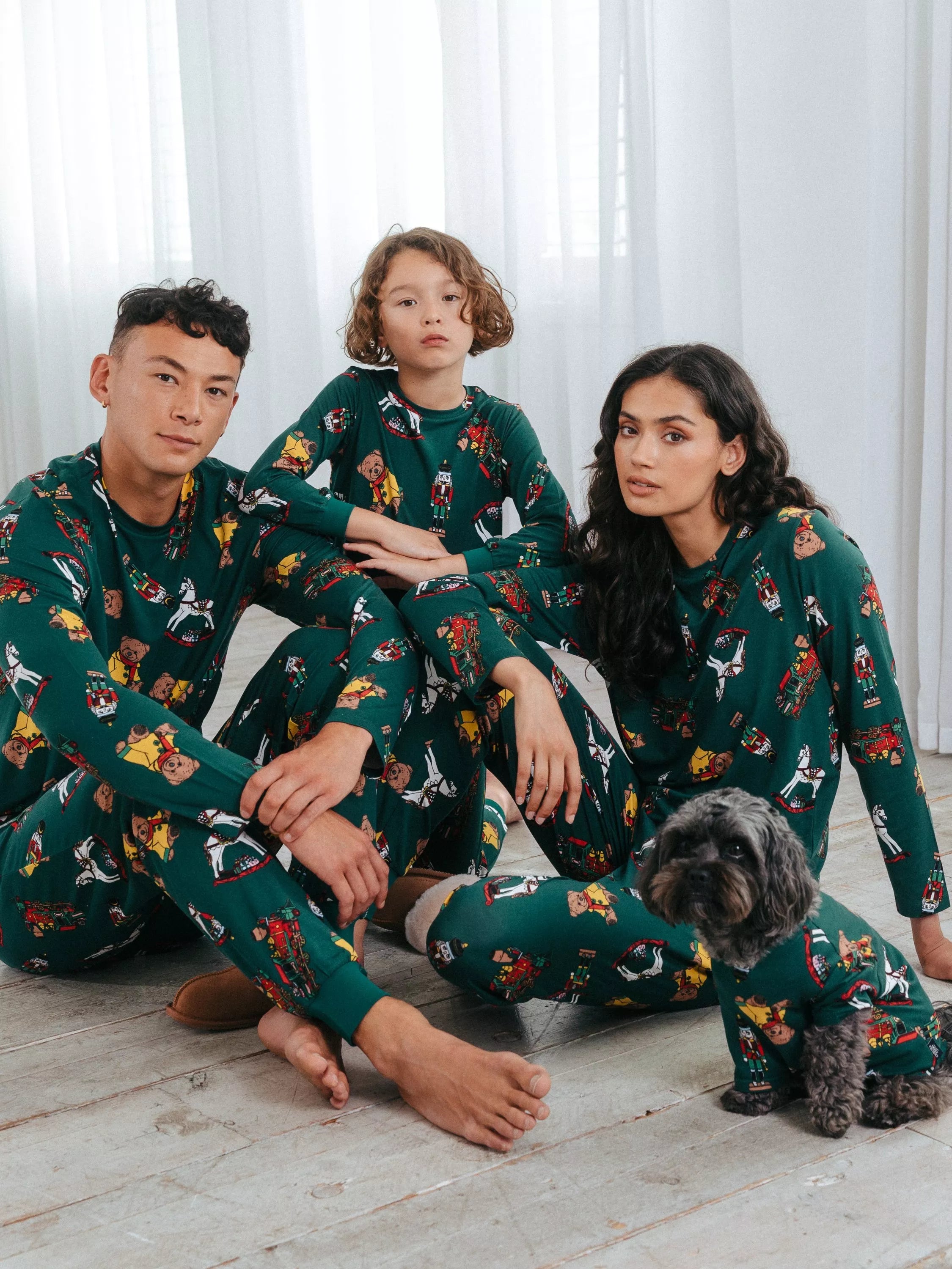Share the magic of Christmas morning in these nostalgic toy print pyjamas. Hand-drawn by a team of talented designers: rocking horses, teddy bears, nutcrackers and toy trains adorn these soft and comfy pyjamas.