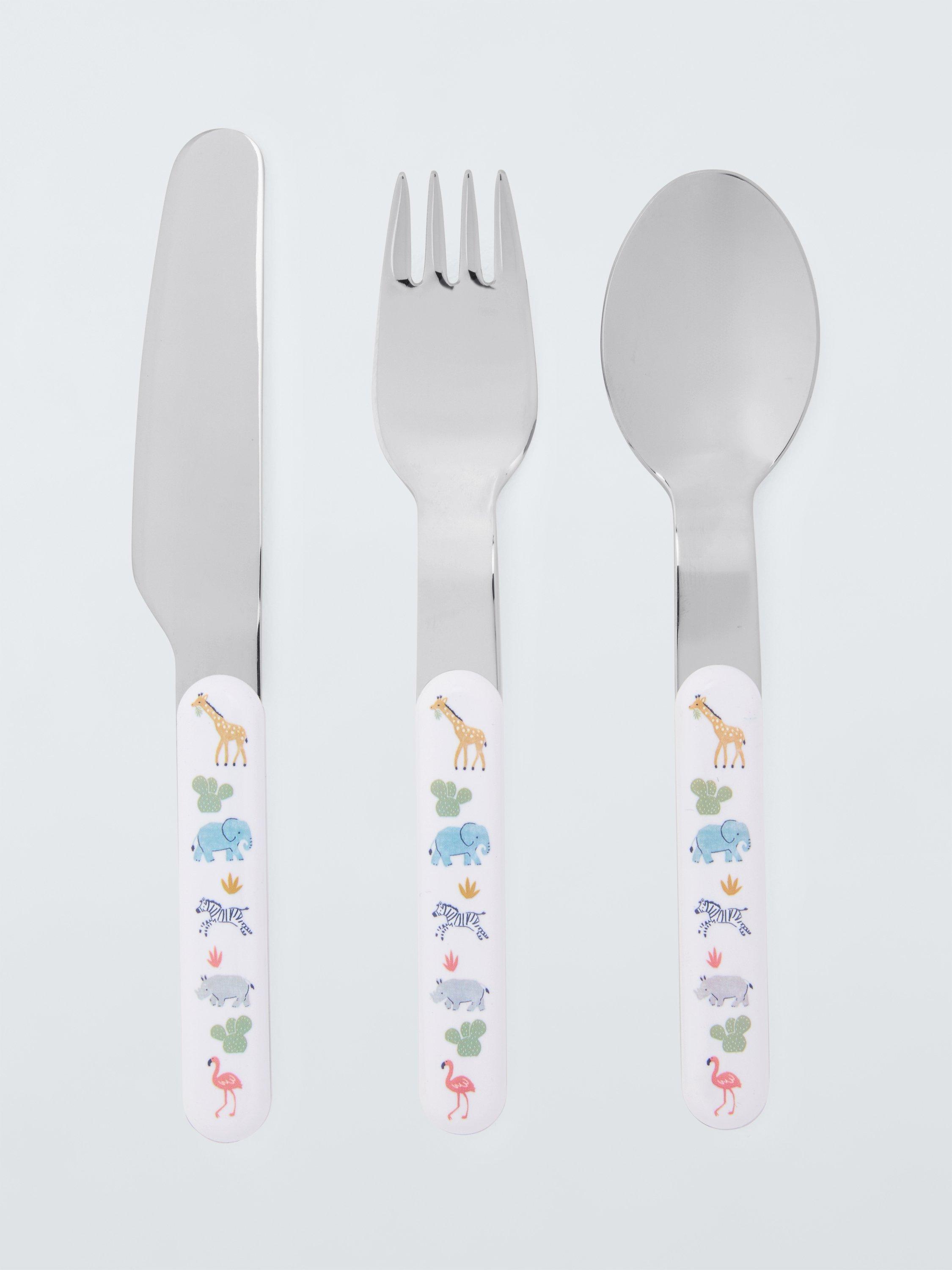 This John Lewis Childrens Safari Cutlery Set is a wonderful three-piece collection ideal for young diners building independence at mealtimes. It includes a knife, fork, and dessert spoon, all manufactured from robust 18/10 stainless steel for prolonged safety. The comfortable handles feature engaging safari animals, simplifying every meal for your child.