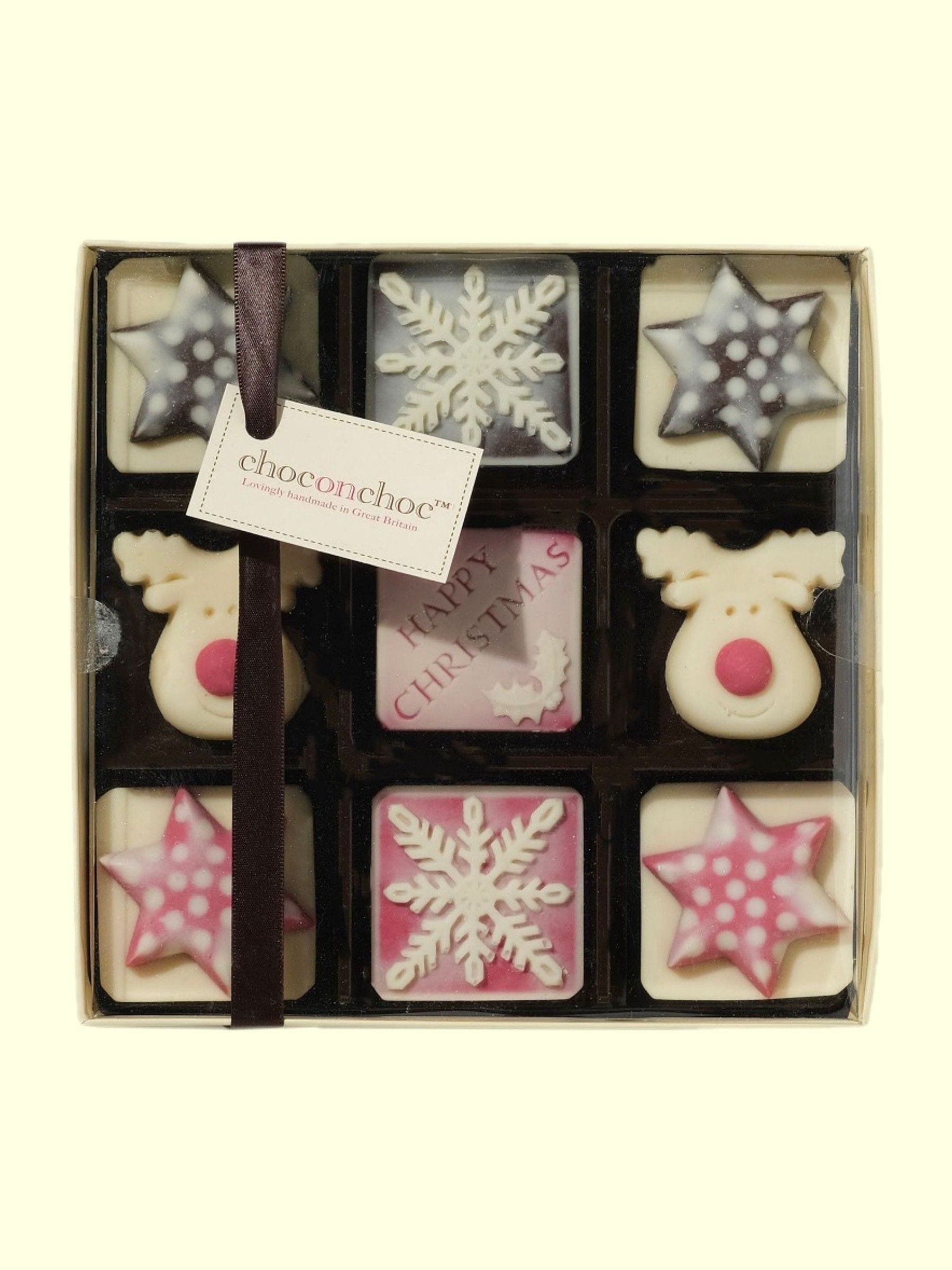 A Christmas wonderland with snowflakes, stars, reindeers complete with a Merry Christmas message. Handmade from white and dark belgian chocolate by artisan chocolatiers in Somerset.