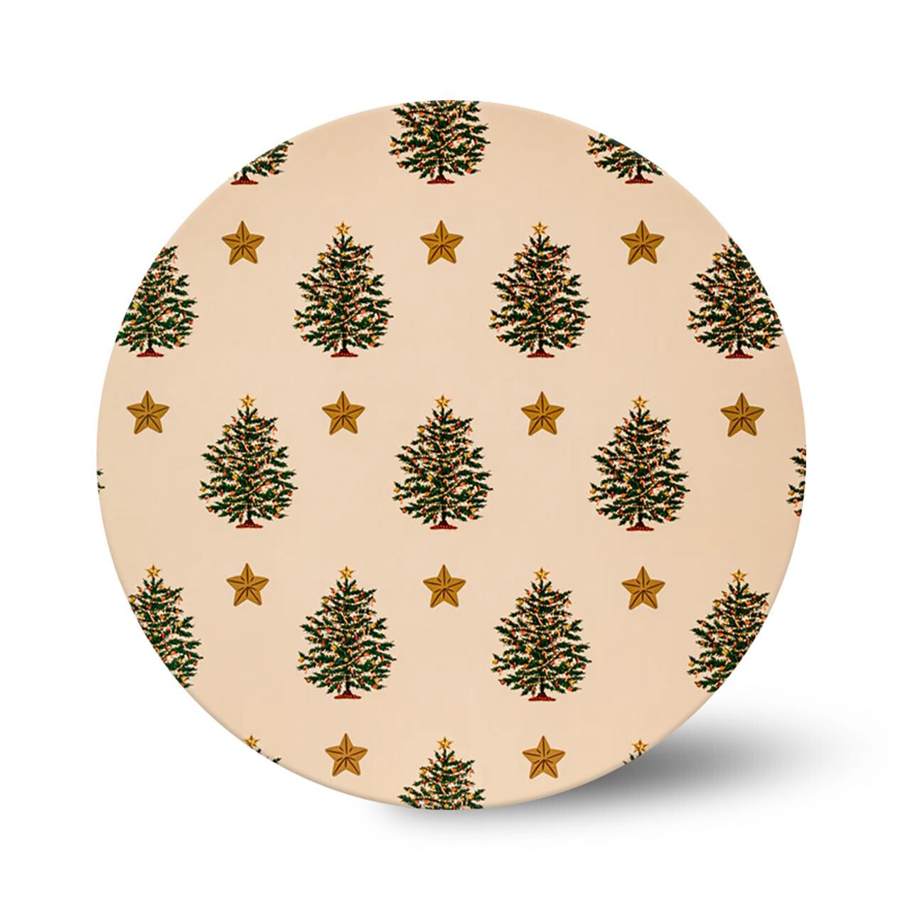 This high-quality 12-inch round cake board presents your baked creations with a charming festive design. It features a traditional Christmas tree and star pattern printed across the surface, ideal for holiday celebrations. The construction ensures your decorated items are securely displayed throughout any event.