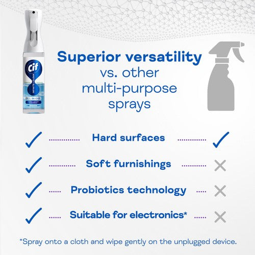 Cif Infinite Clean Sensitive is formulated as an ultimate cleaning companion suitable for use throughout your home and beyond. This versatile solution effectively cleans surfaces ranging from greasy kitchen hobs and dirty tiles to dusty bookshelves and glass tables. It features a continuous mist spray, allowing for quick application during your cleaning routine.