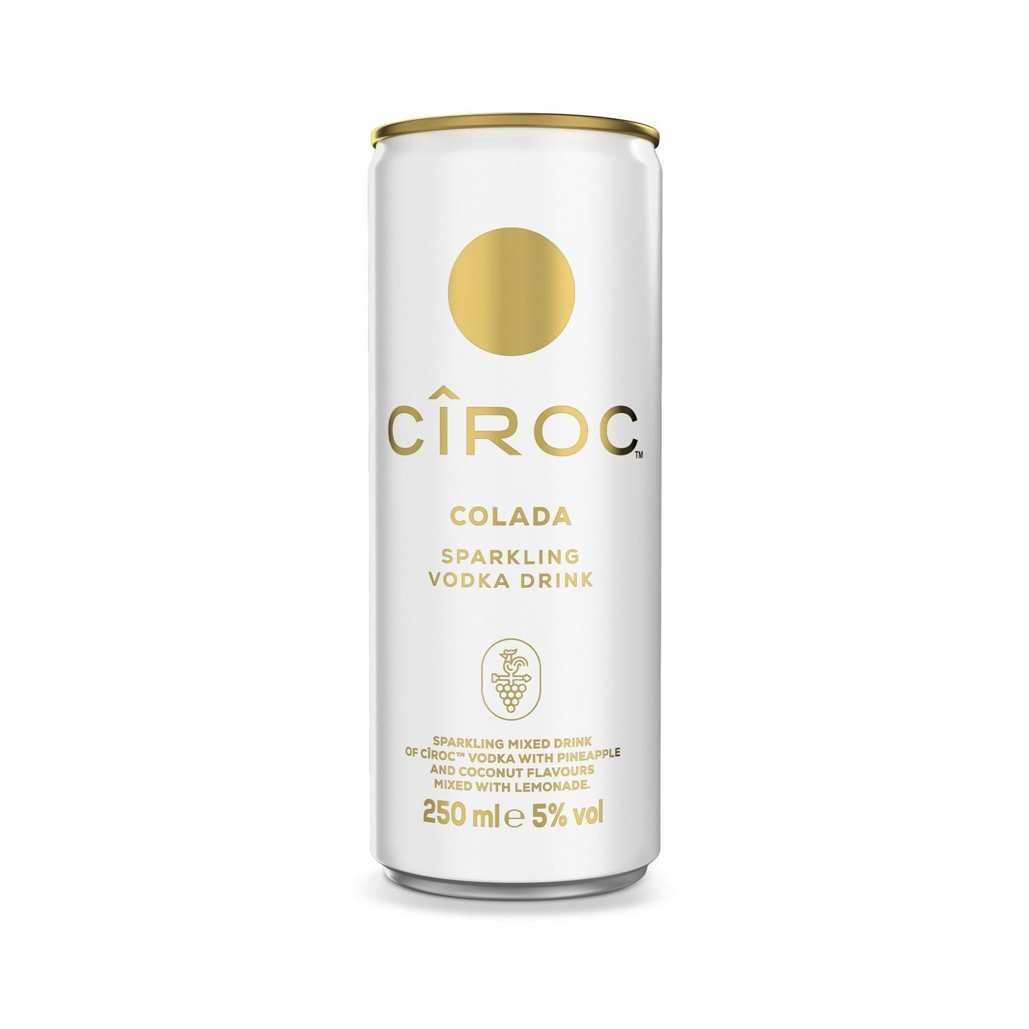 This Cîroc Colada is a new twist on a classic flavour, expertly crafted for immediate enjoyment. It combines Cîroc super-premium vodka with natural ingredients, offering a convenient, high-quality beverage option. This ready to drink cocktail captures tropical tastes perfectly.