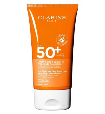 Read MoreClarins Sun Care Cream for Body SPF 50+ provides high protection against the harmful effects of the sun, free radicals and blue light. This comfortable formula preserves skins youth without leaving behind any white streaks to reveal a beautiful tan. Hydrates the skin with a non-greasy, invisible finish that is ideal for all skin tones. Suitable for outdoor activities and water-resistant. Contains our Solar Protect Complex with Organic Cocoa Extract to firm and moisturize skin as well as Vitamin E derivative for antioxidant action. Aloe Vera extract and Argan Oil nourish skin.