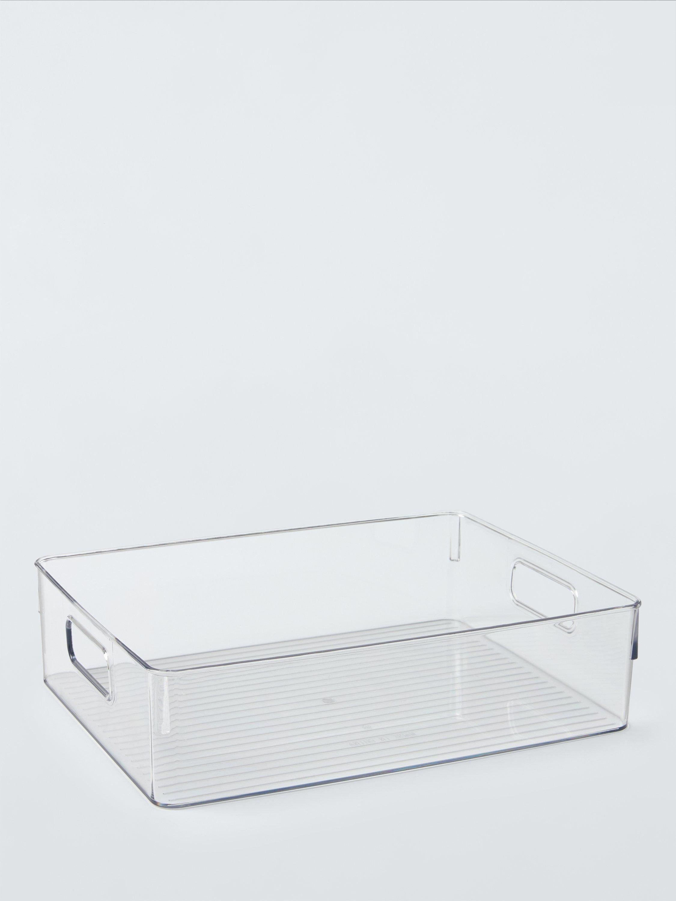 This John Lewis storage box presents a long, clear design ideal for organising various household items efficiently. Its low profile fits perfectly under beds or on shallow shelving units, keeping clutter discreetly hidden from view. This practical container features robust handles ensuring simple movement and effective tidy storage throughout any room.