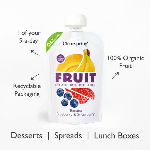 Read MoreClearspring Organic FRUIT 100% Fruit Puree offers a naturally sweet and harmonious blend of premium organic bananas, blueberries, and strawberries. Convenient and minimally processed, it is free from added sugars or concentrates and each pouch contributes towards 1 of your 5-a-day. It is perfect for the whole family to enjoy at home or on the go and is now available in recyclable packaging.