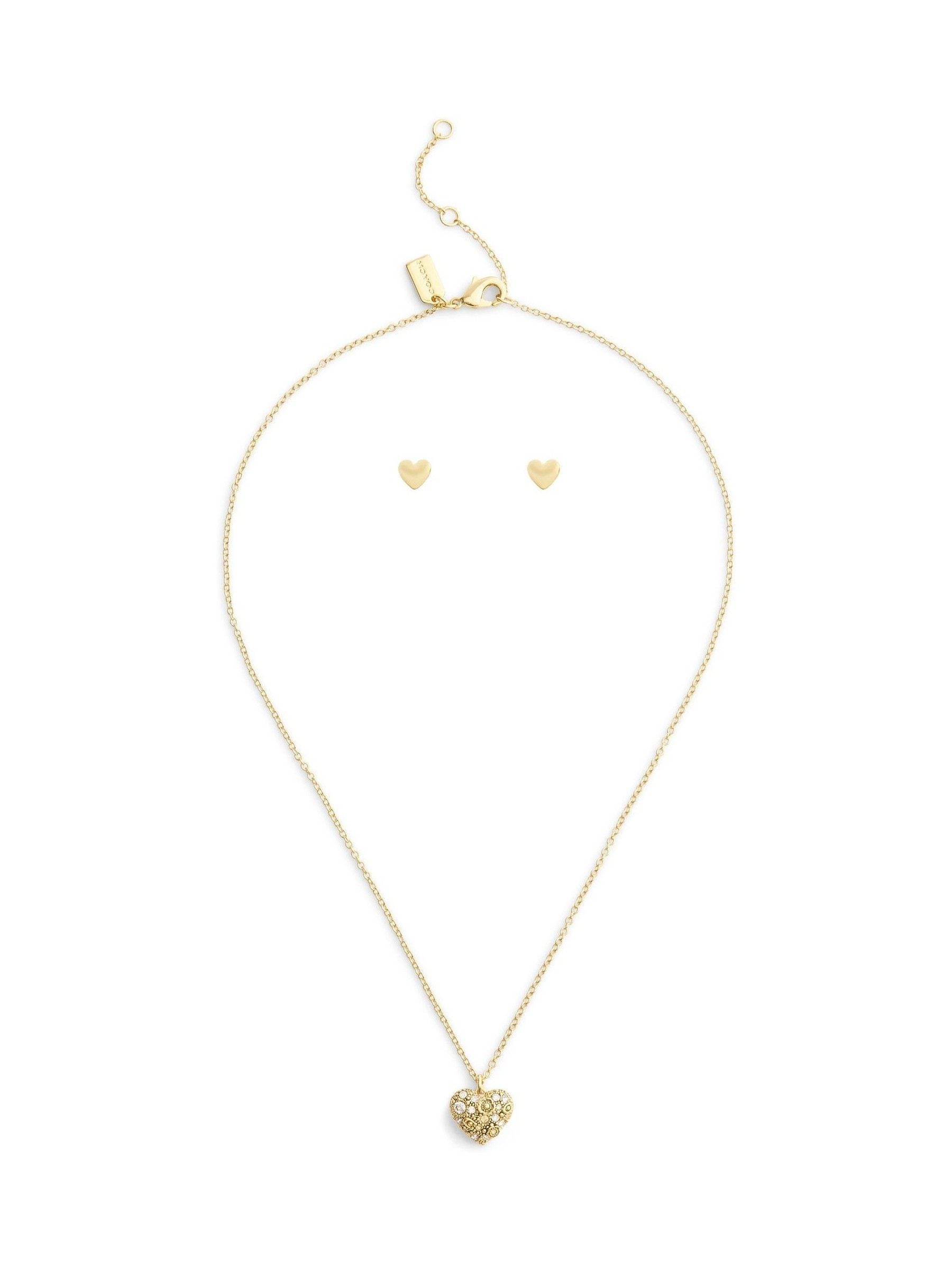 Sophisticated jewelry set featuring coordinating necklace and earrings. Refined chain necklace featuring timeless heart pendant adorned with sparkly pavé, signature sculpted C hardware and iconic tea roses. Perfectly paired with everyday heart stud earrings with hypoallergenic titanium posts to complete the look. Comes packaged in a signature COACH gift box. Necklace has an adjustable lobster clasp closure and earrings have a post back closure. Made from brass, glass crystal and titanium. Dimensions: Neckalce Length: 406mm + 51mm Extender, Earring Length: 6mm, Pendant Width: 13mm, Earring Width: 6mm, Pendant Drop: 13mm.