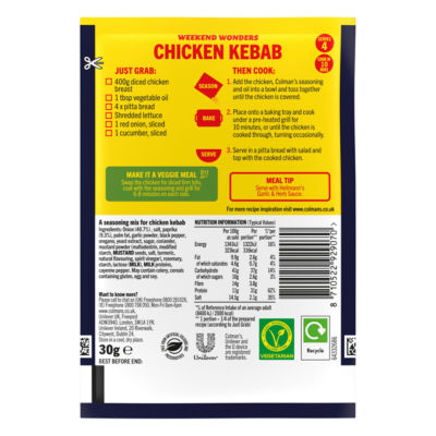 FeaturesWhip up your own full-on-flavour version of your favourite takeaway with Colman’s Big Night In Chicken Kebab Recipe Mix. An irresistible seasoning mix with classic herbs and spices for a delicious takeaway-style kebab in minutes. Our chicken kebab recipe mix contains no artificial colours, preservatives, or added MSG, and comes in an easy-to-use, recyclable paper pack. With this spice mix, you can make tasty chicken kebabs in just three simple steps. For a meat-free take on this classic family meal, why not swap the chicken for diced firm tofu?. Colman's recipe mix provides 4 servings, so you always have a full-on-flavour, pound-saving meal at hand.